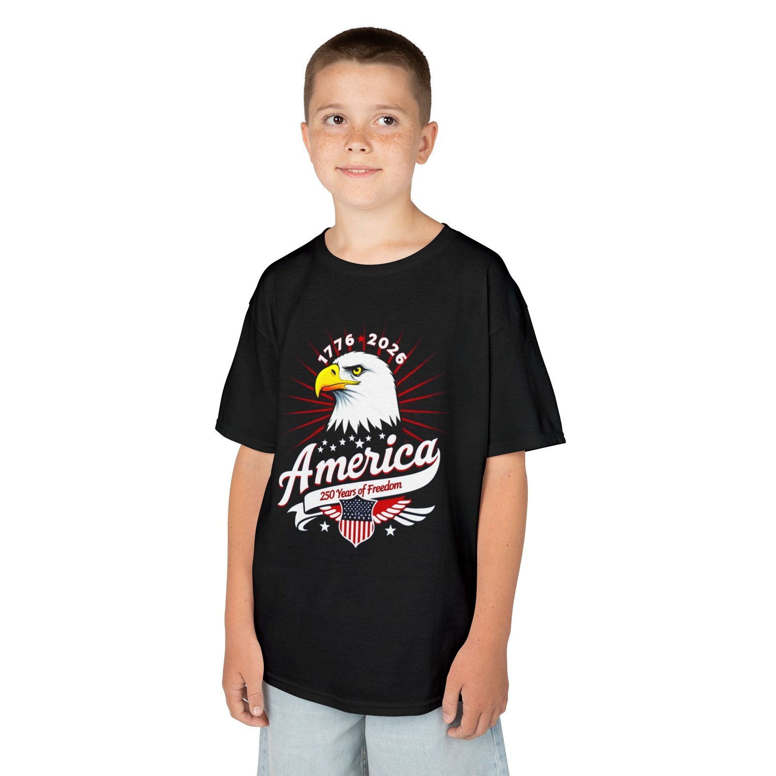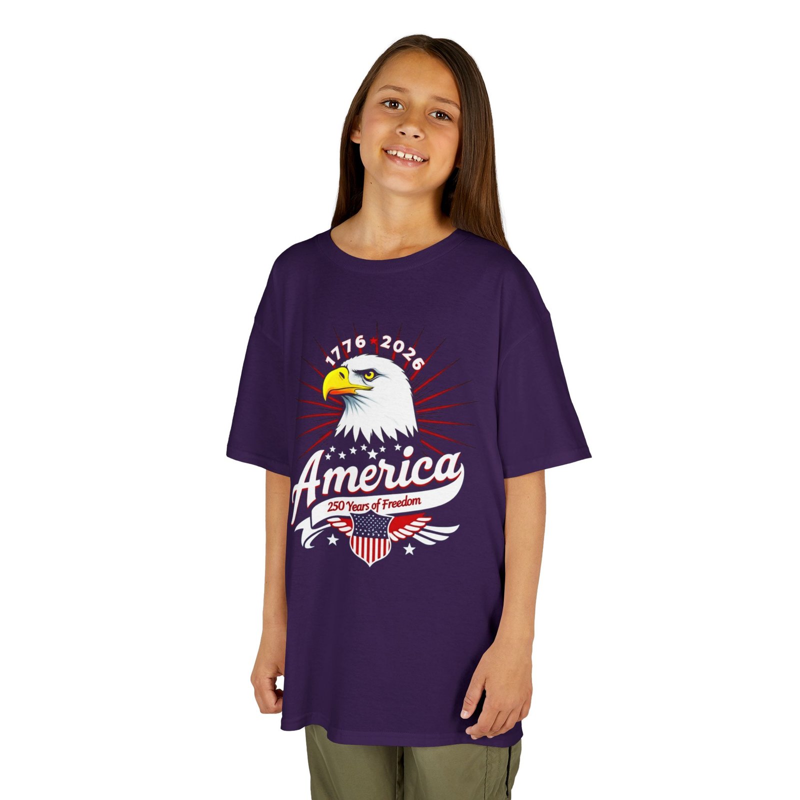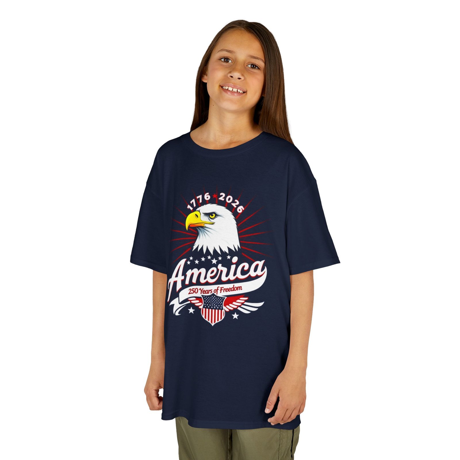 Let kids show their pride in style with the America Eagle Kids Tee! Featuring a bold bald eagle graphic—the ultimate symbol of American freedom—this youth t-shirt is perfect for patriotic holidays, school events, or the 1776–2026 Semiquincentennial celebrations. Ideal for Independence Day parades, history fairs, and everyday wear, this shirt combines comfort with a timeless design that honors America’s heritage.
