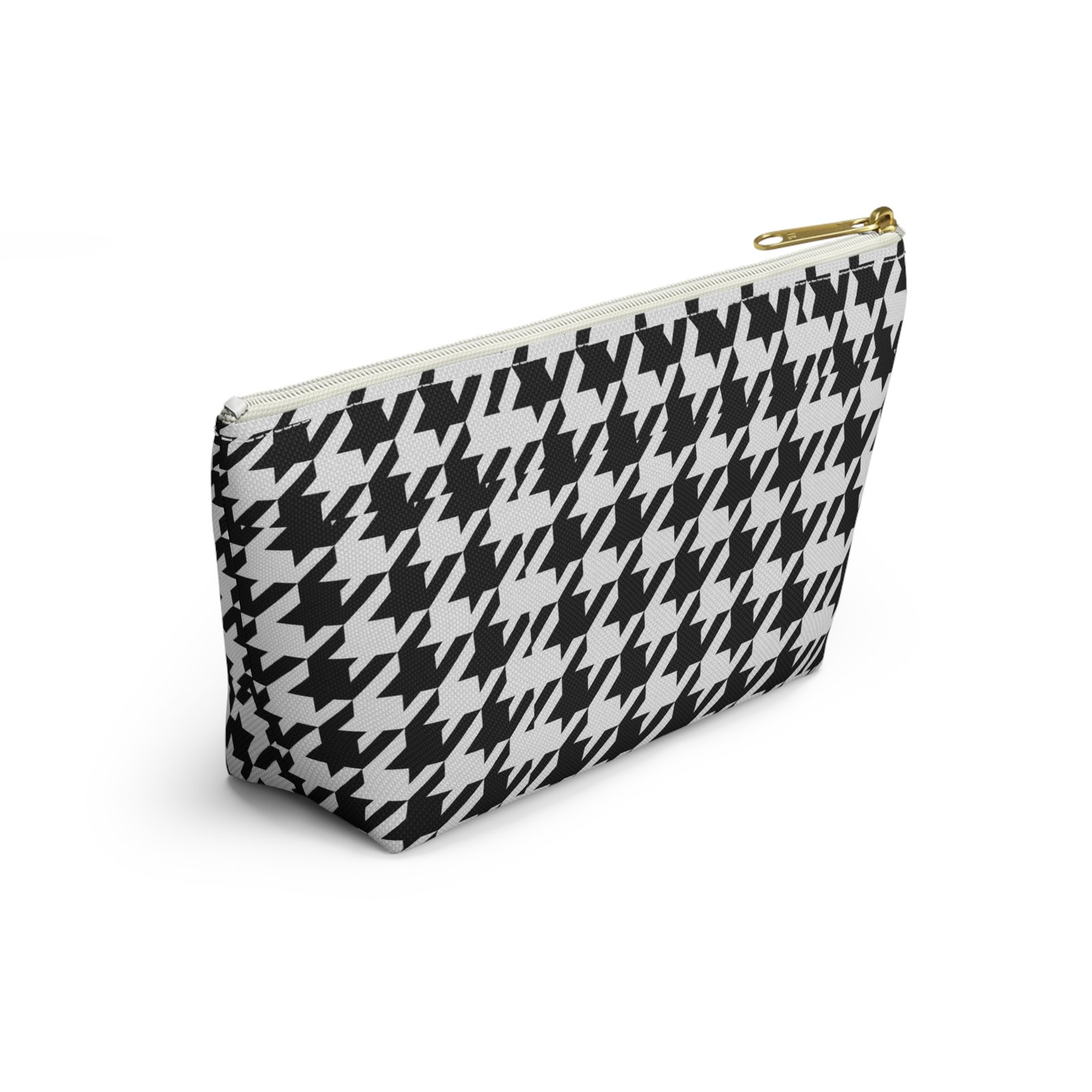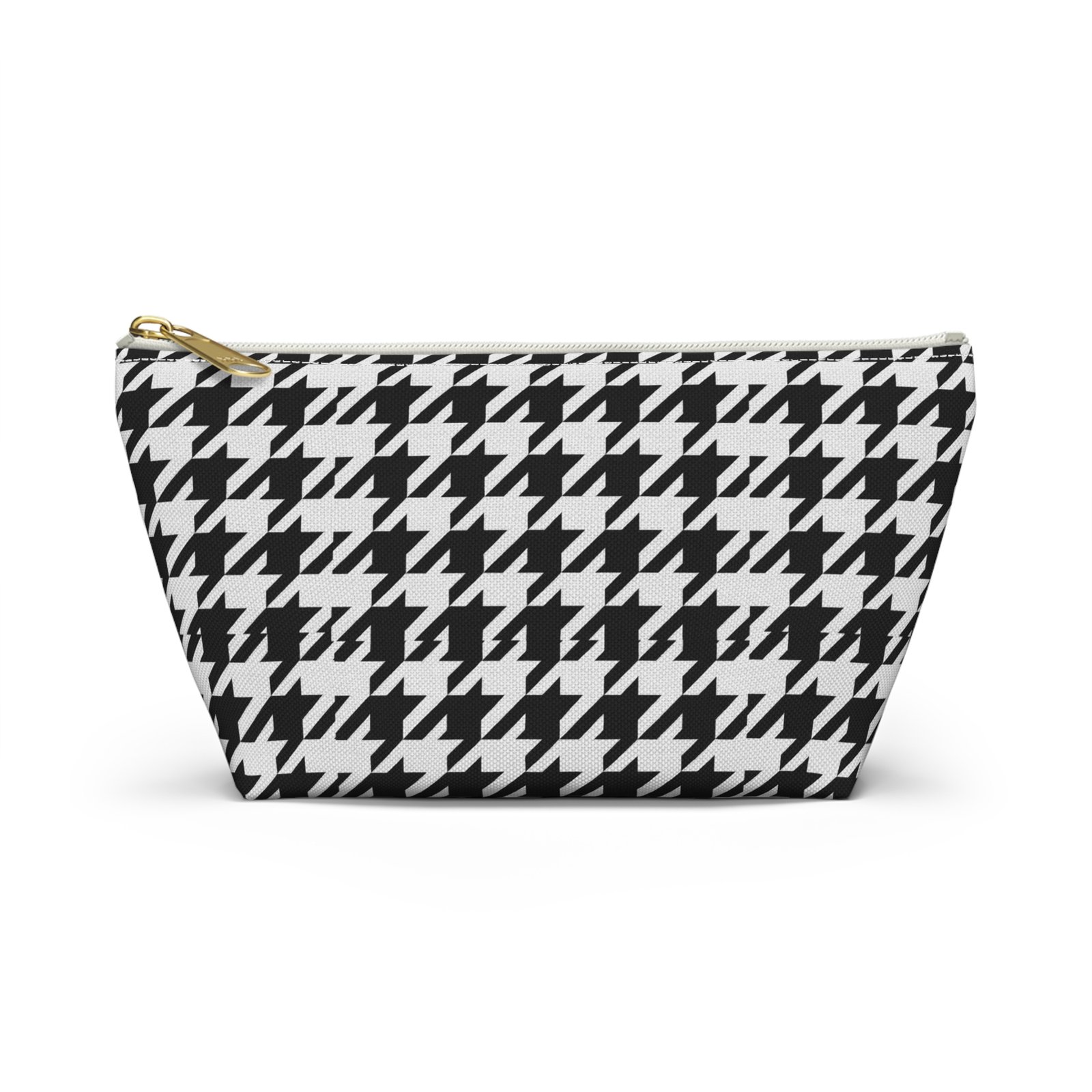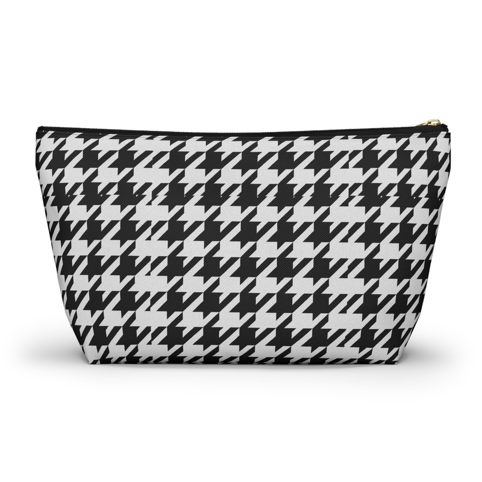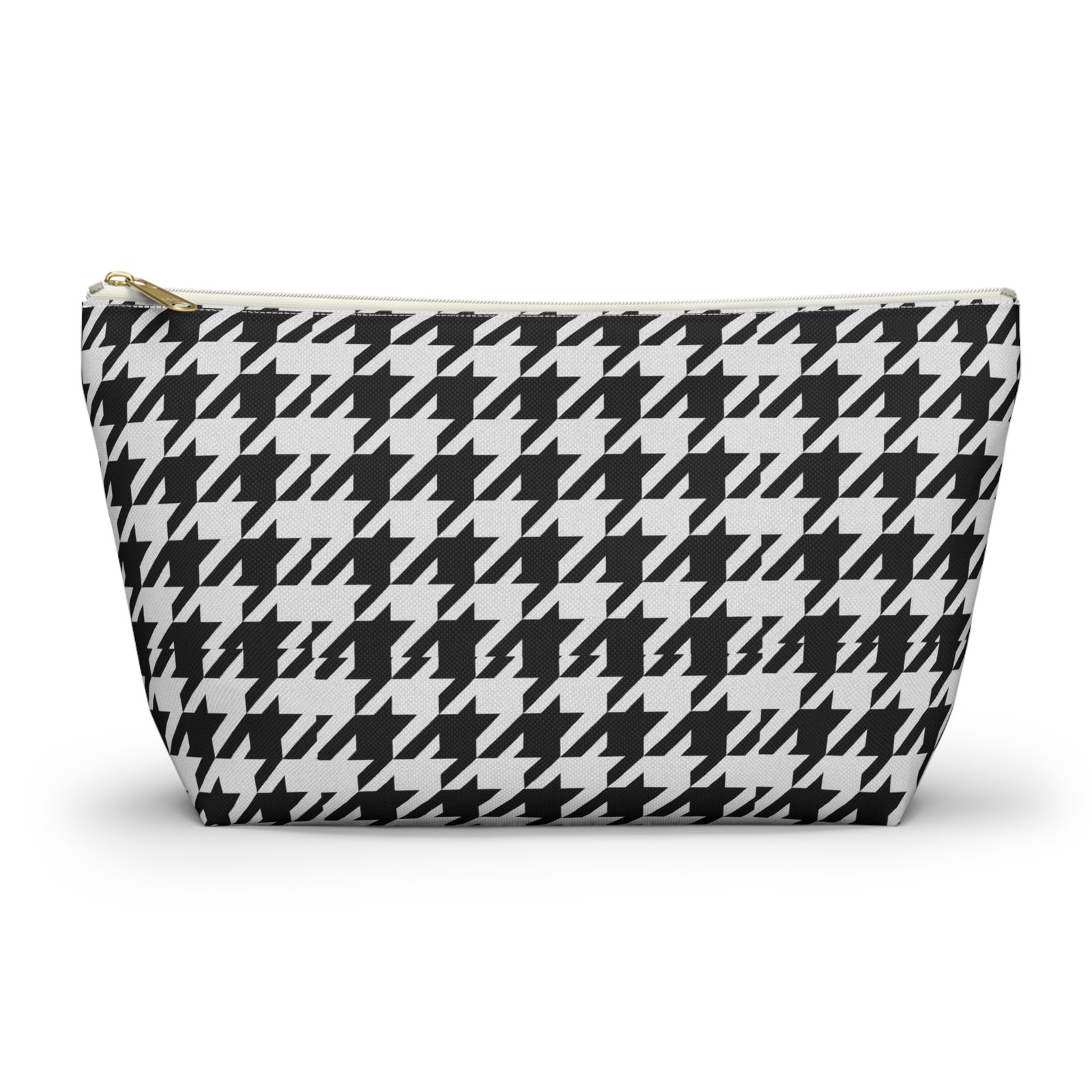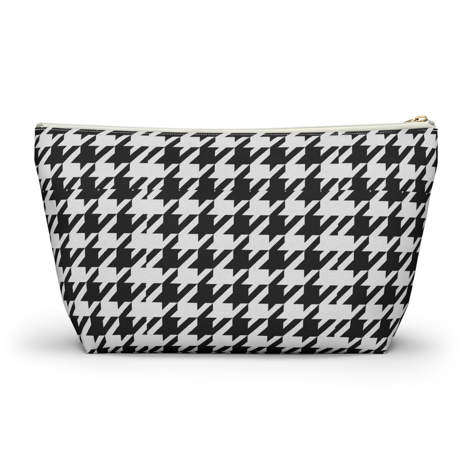 A chic accessory pouch that brings classic houndstooth into everyday life. The structured T-bottom gives the pouch a steady base so it sits open on a counter while you reach for essentials. The bold black-and-white pattern reads modern and confident — good for a quick makeup refresh, corralling cords in a tote, or keeping small tools organized at a workspace. The gold-tone zipper pull adds a subtle flash of polish against the graphic print, while the laminated interior protects the exterior print and helps contain spills. Lightweight, low-maintenance, and designed to hold up to daily use, this pouch slips into larger bags or stands alone on a vanity or desk.