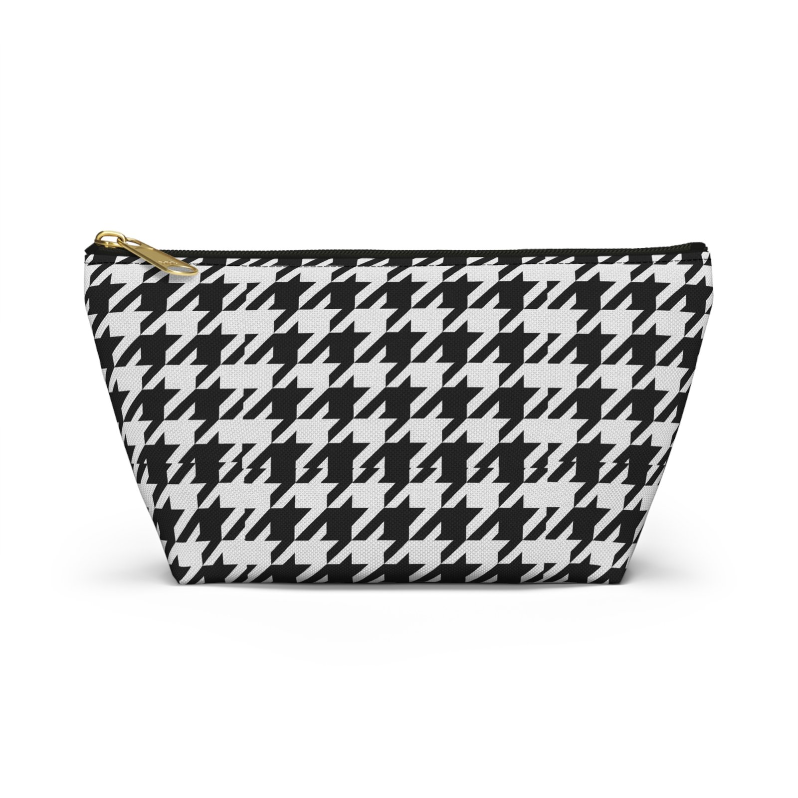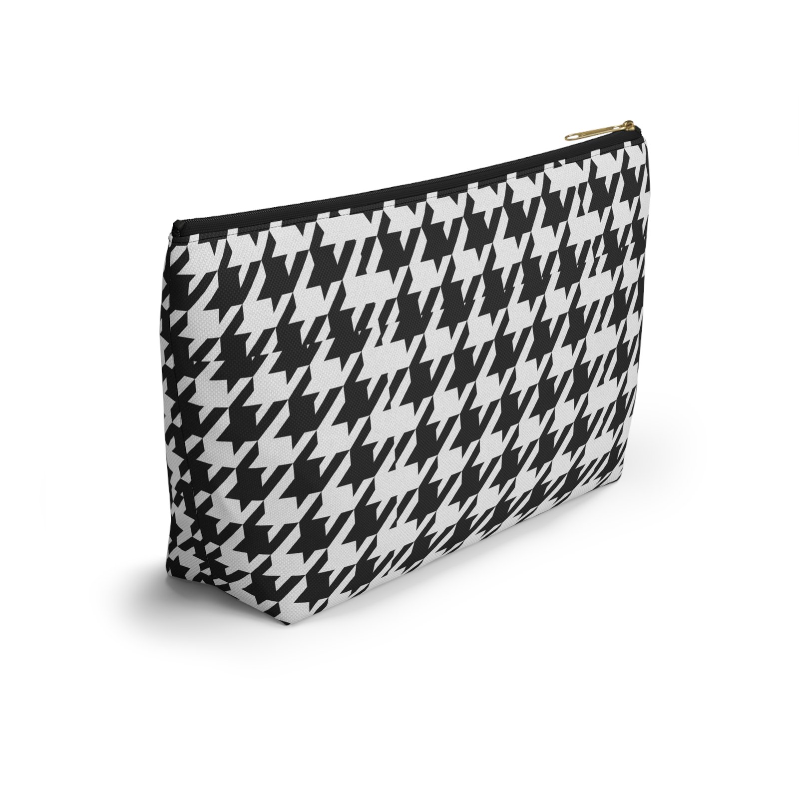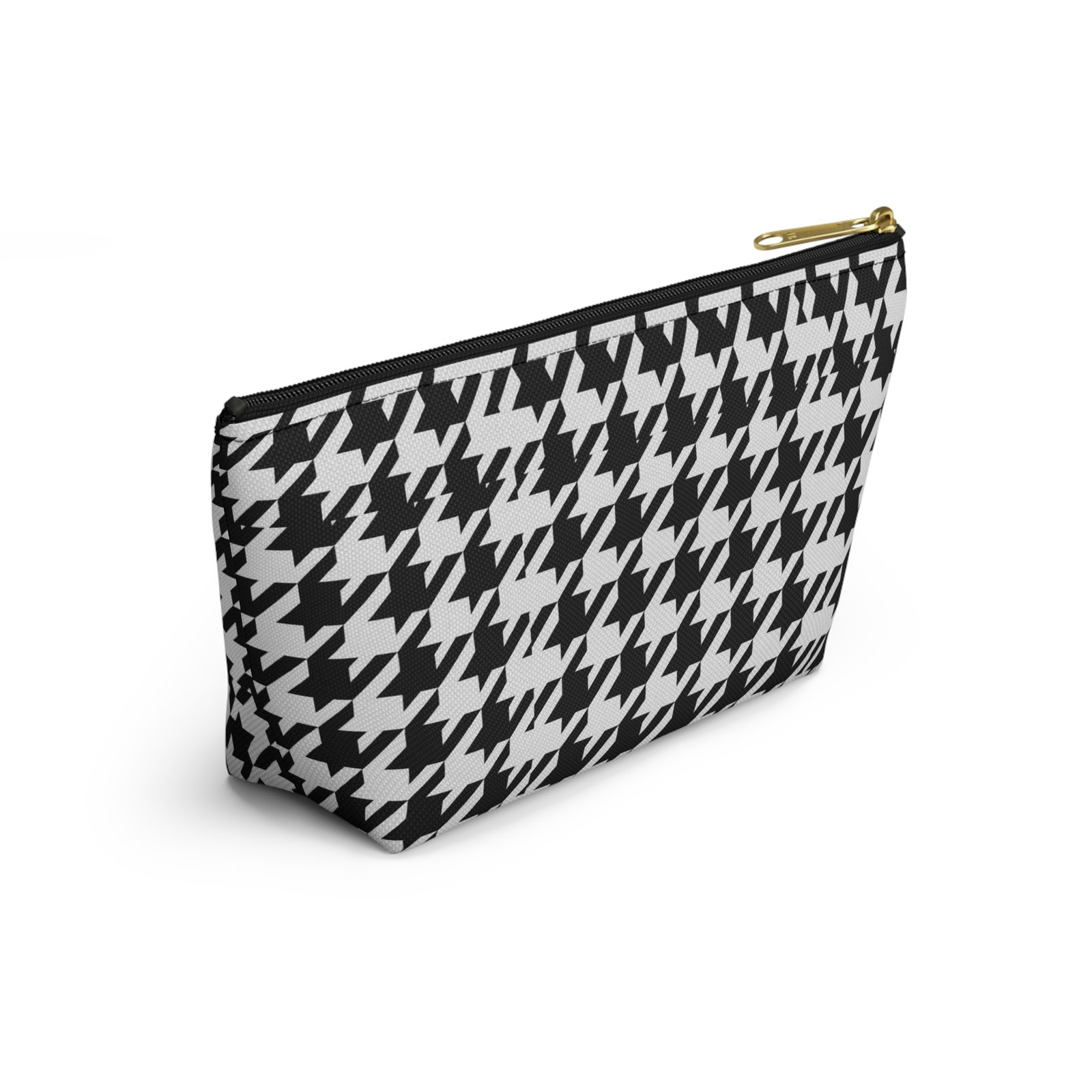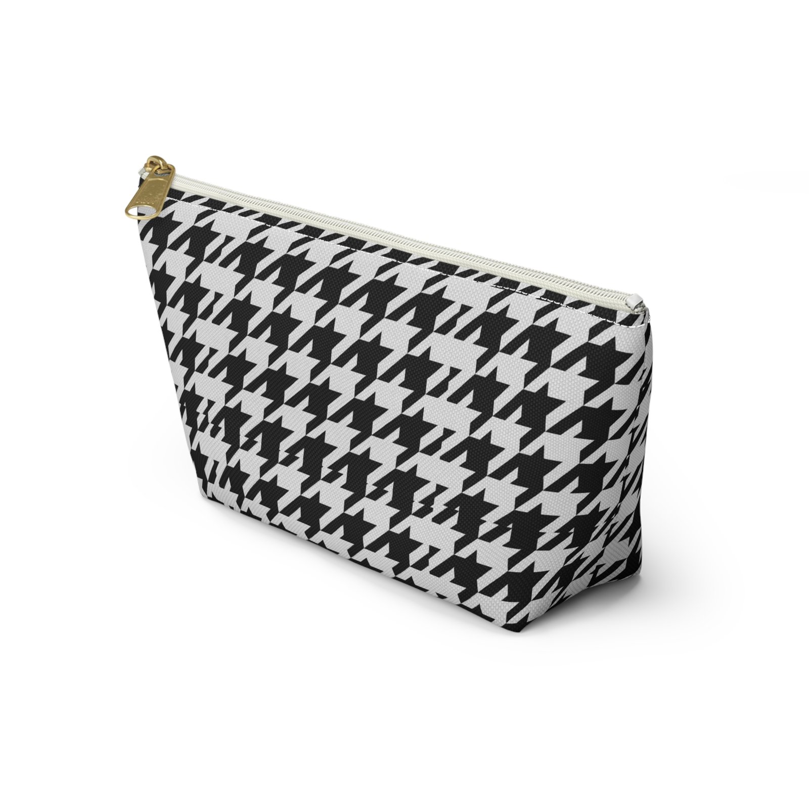 A chic accessory pouch that brings classic houndstooth into everyday life. The structured T-bottom gives the pouch a steady base so it sits open on a counter while you reach for essentials. The bold black-and-white pattern reads modern and confident — good for a quick makeup refresh, corralling cords in a tote, or keeping small tools organized at a workspace. The gold-tone zipper pull adds a subtle flash of polish against the graphic print, while the laminated interior protects the exterior print and helps contain spills. Lightweight, low-maintenance, and designed to hold up to daily use, this pouch slips into larger bags or stands alone on a vanity or desk.