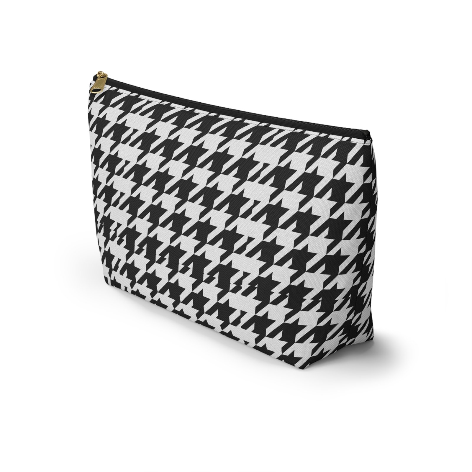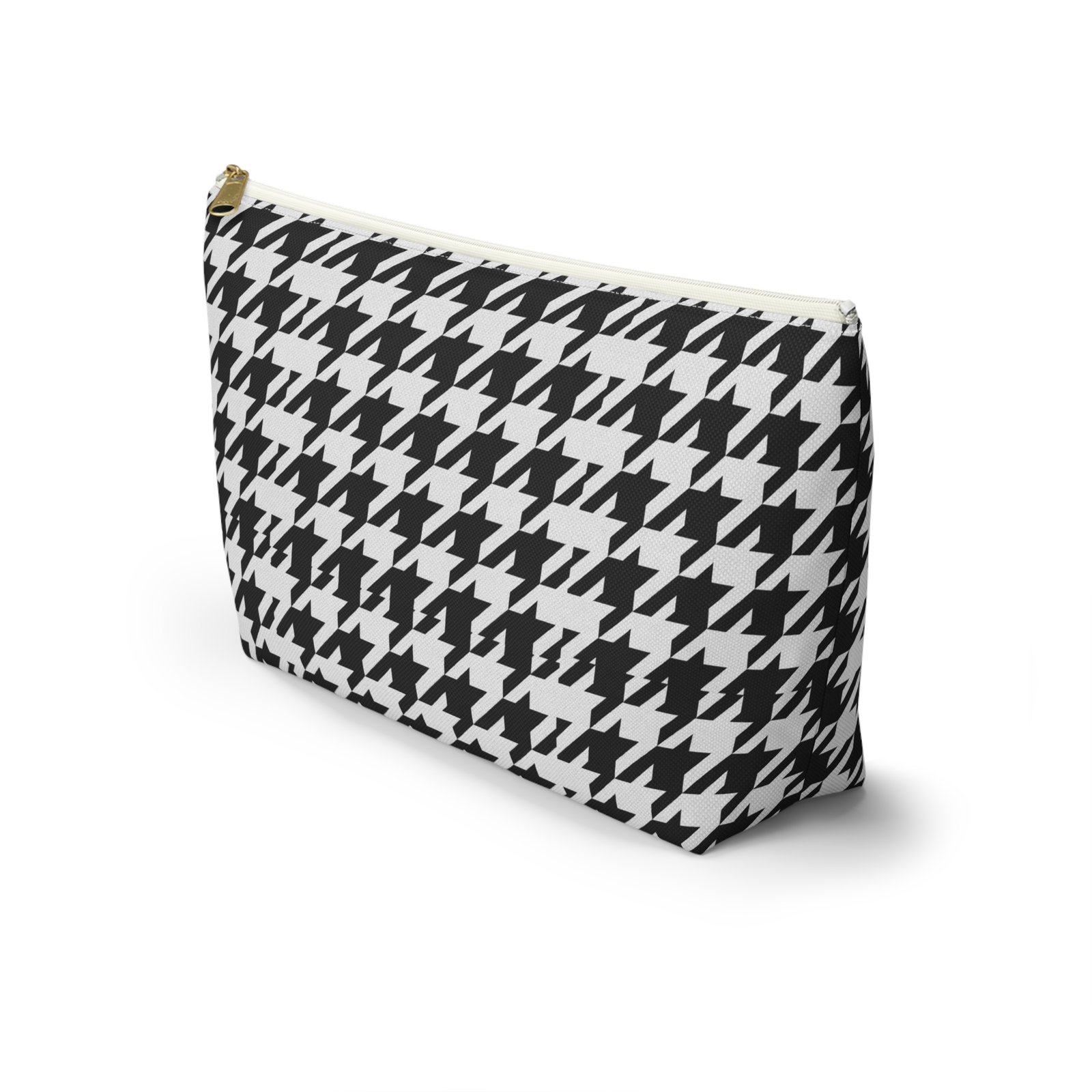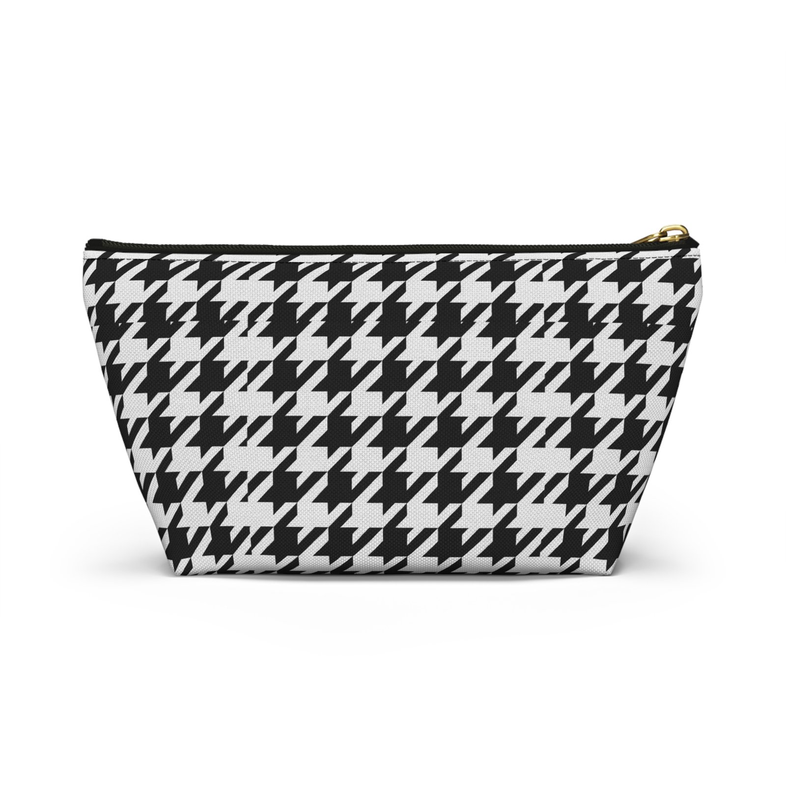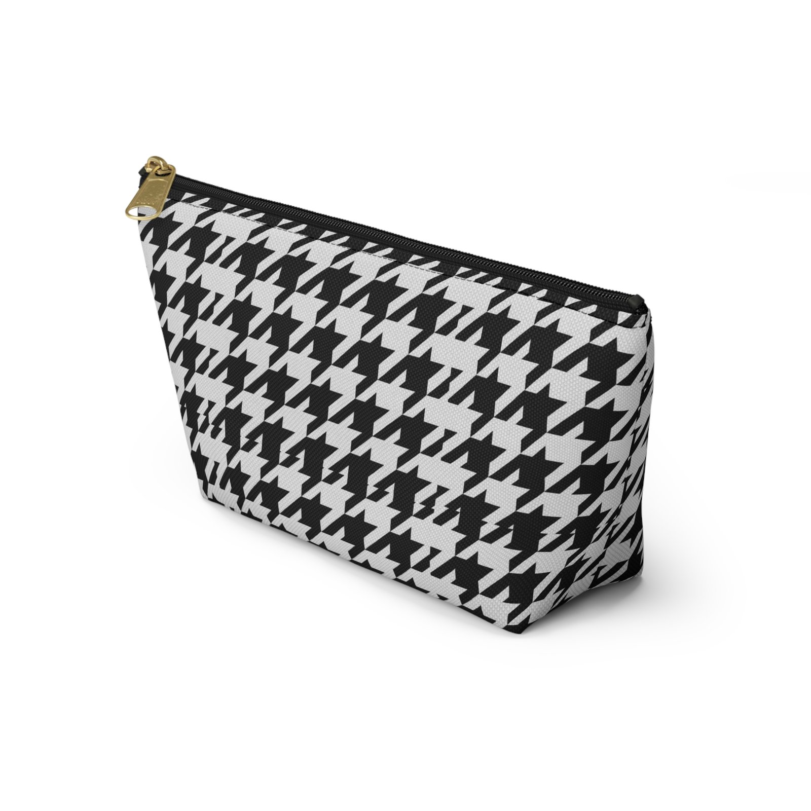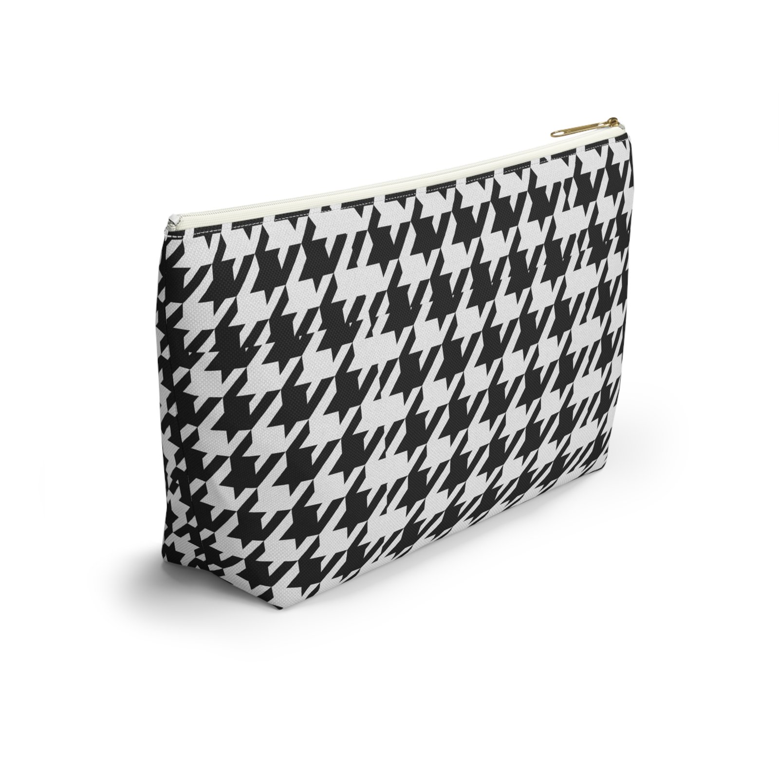 A chic accessory pouch that brings classic houndstooth into everyday life. The structured T-bottom gives the pouch a steady base so it sits open on a counter while you reach for essentials. The bold black-and-white pattern reads modern and confident — good for a quick makeup refresh, corralling cords in a tote, or keeping small tools organized at a workspace. The gold-tone zipper pull adds a subtle flash of polish against the graphic print, while the laminated interior protects the exterior print and helps contain spills. Lightweight, low-maintenance, and designed to hold up to daily use, this pouch slips into larger bags or stands alone on a vanity or desk.
