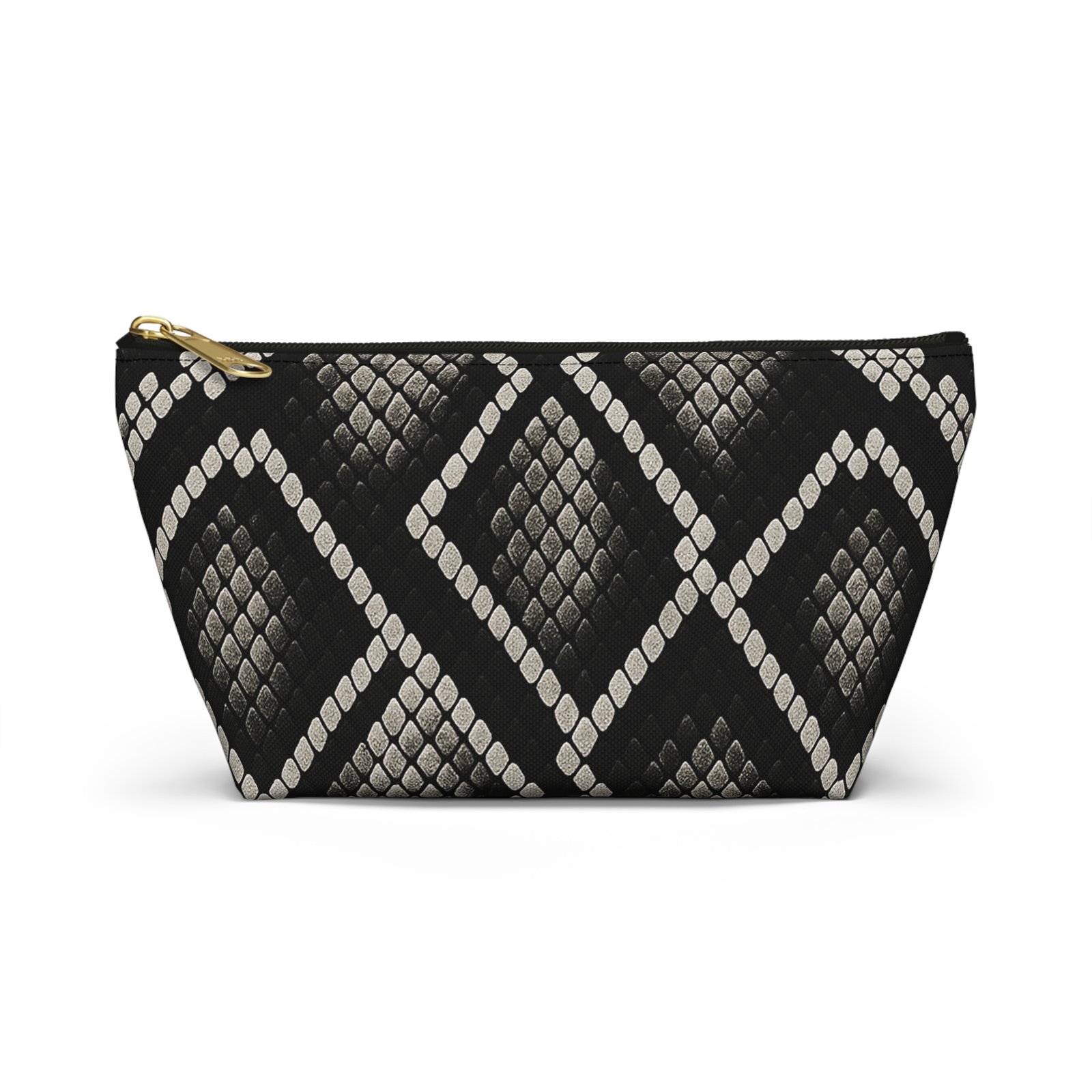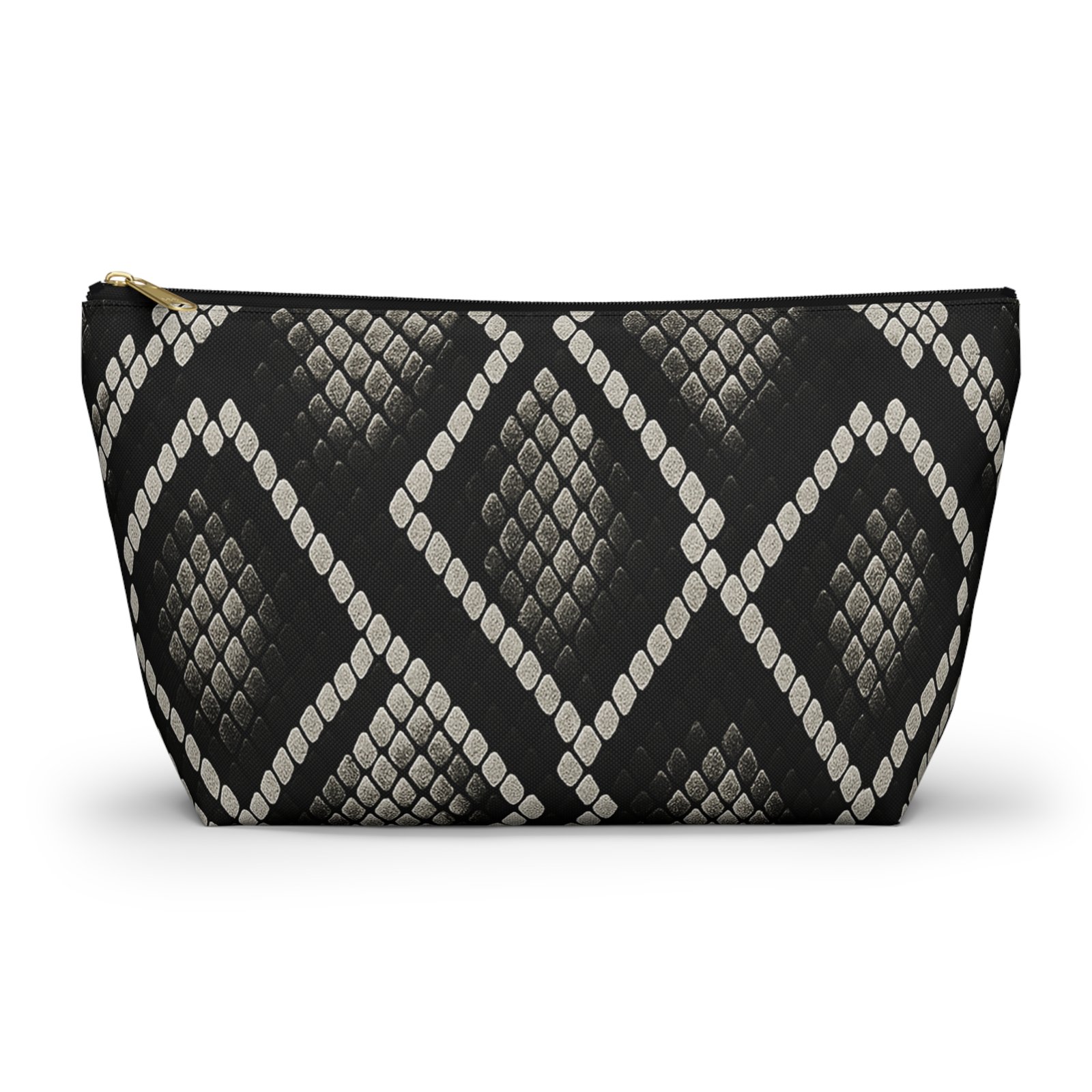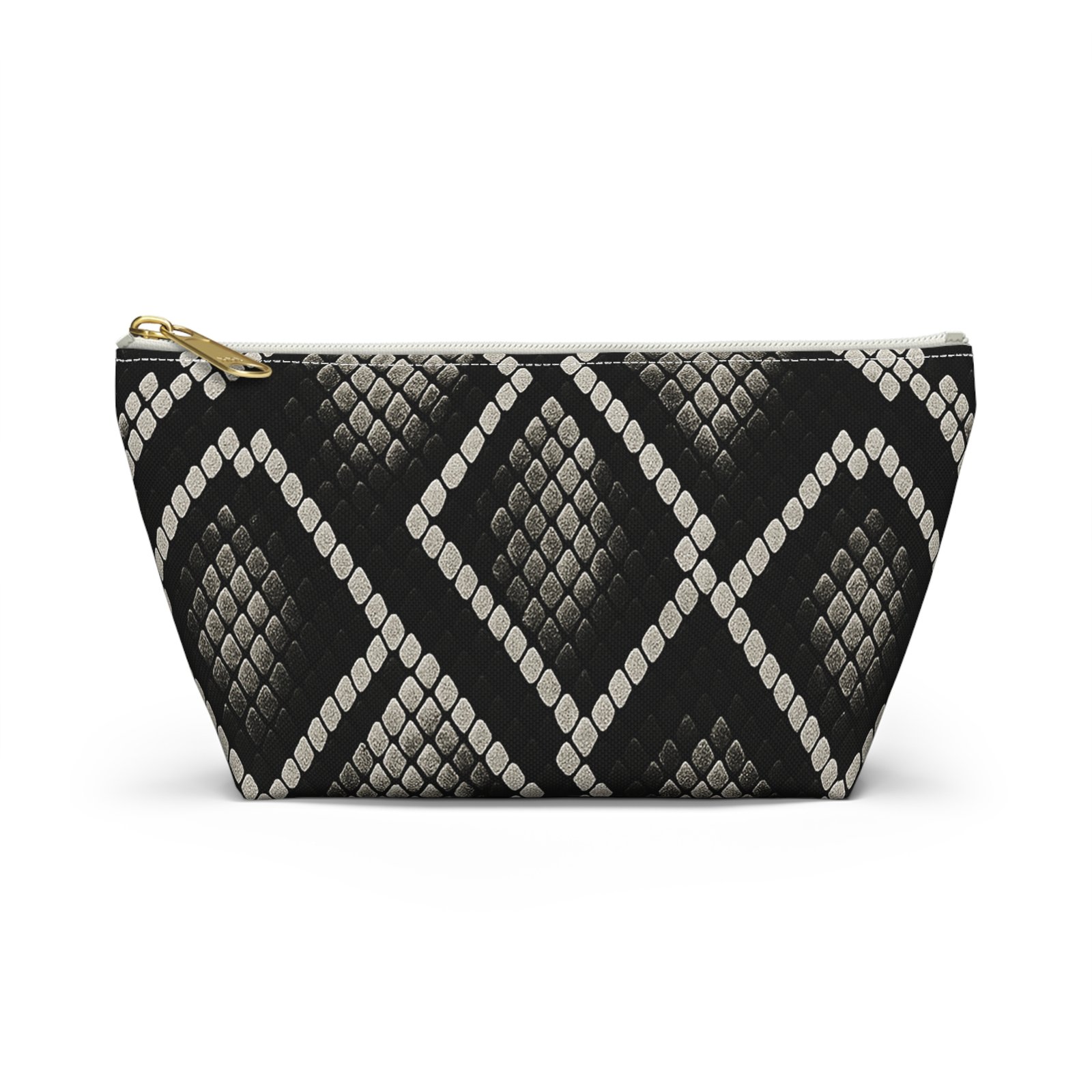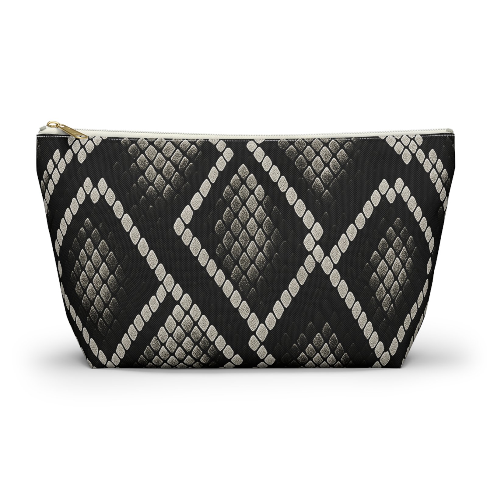 This tapered accessory pouch brings bold, textured style to everyday carry. The roomy T-bottom silhouette stands upright on counters and fits cosmetics, cords, or art supplies without tipping over. A monochrome snakeskin-inspired print gives it an edgy, modern look — matte black and soft gray scales create depth while the gold zipper pull adds a subtle luxe touch. Lightly structured polyester holds shape and resists wrinkles, and the laminated interior protects against spills and makes wiping quick and easy. Slip it into a tote or keep it on your vanity; it’s made to travel through your day with confidence and a quiet attitude.