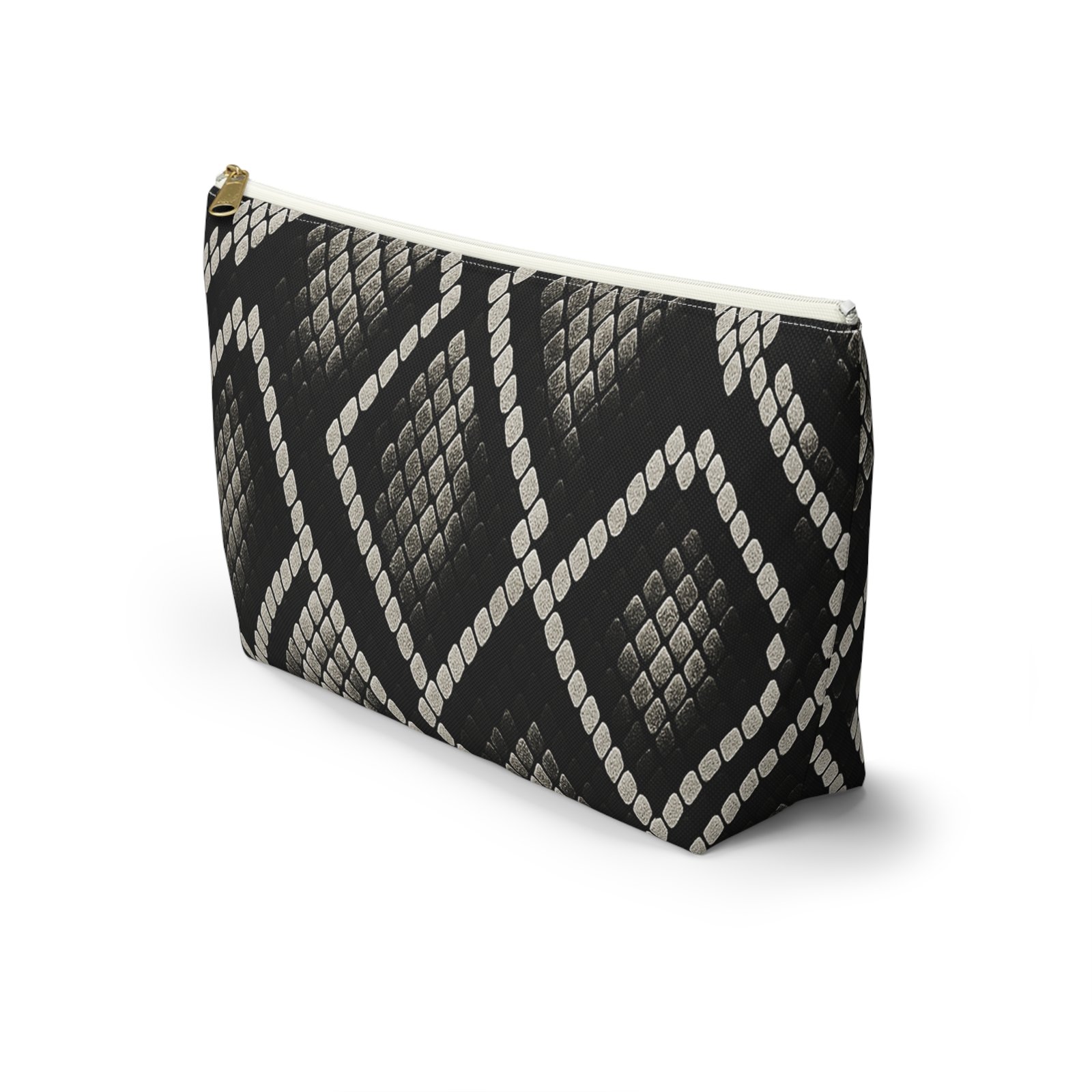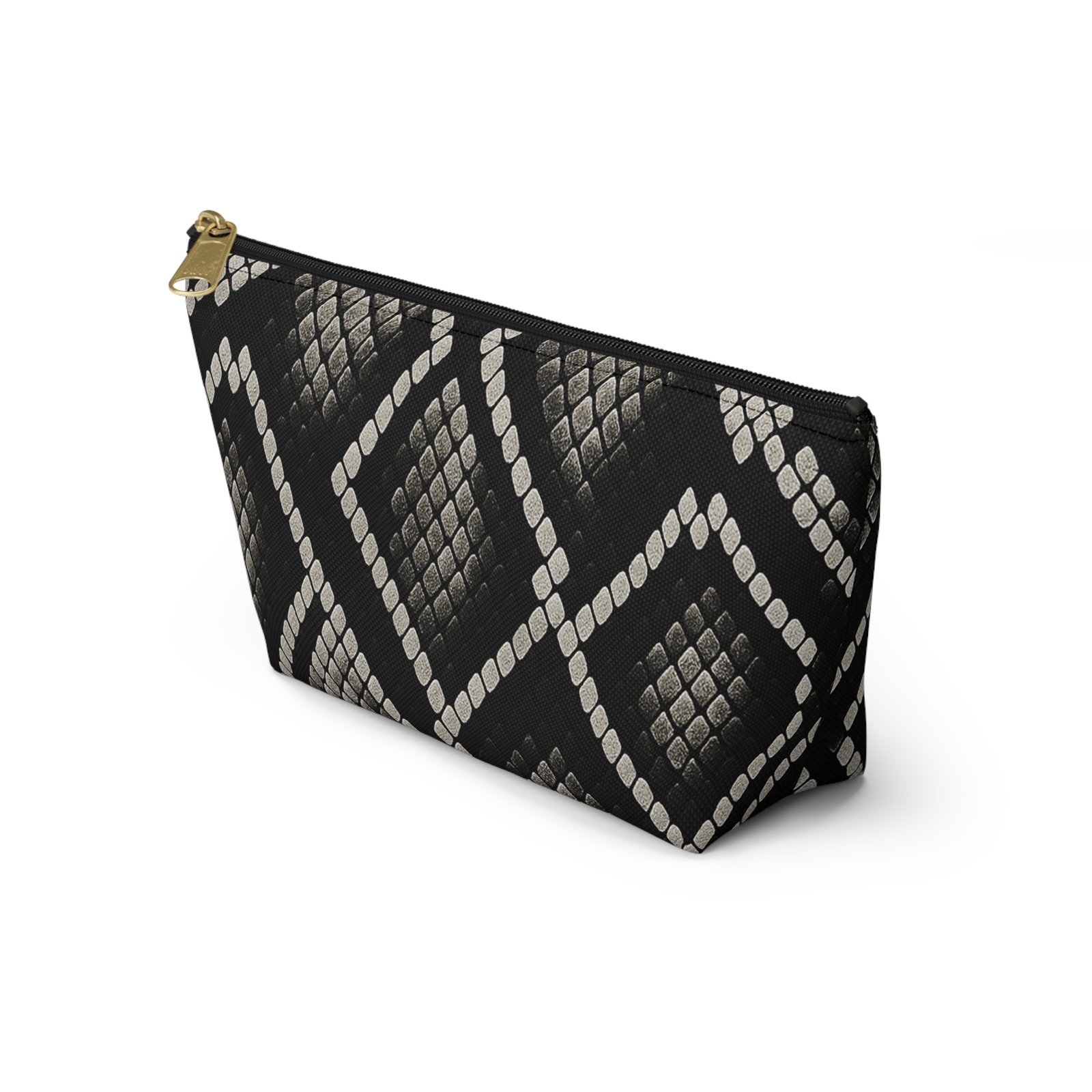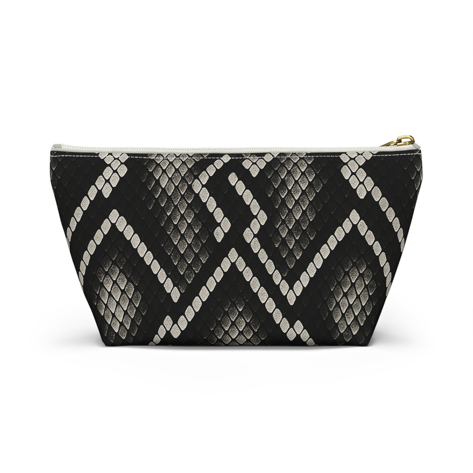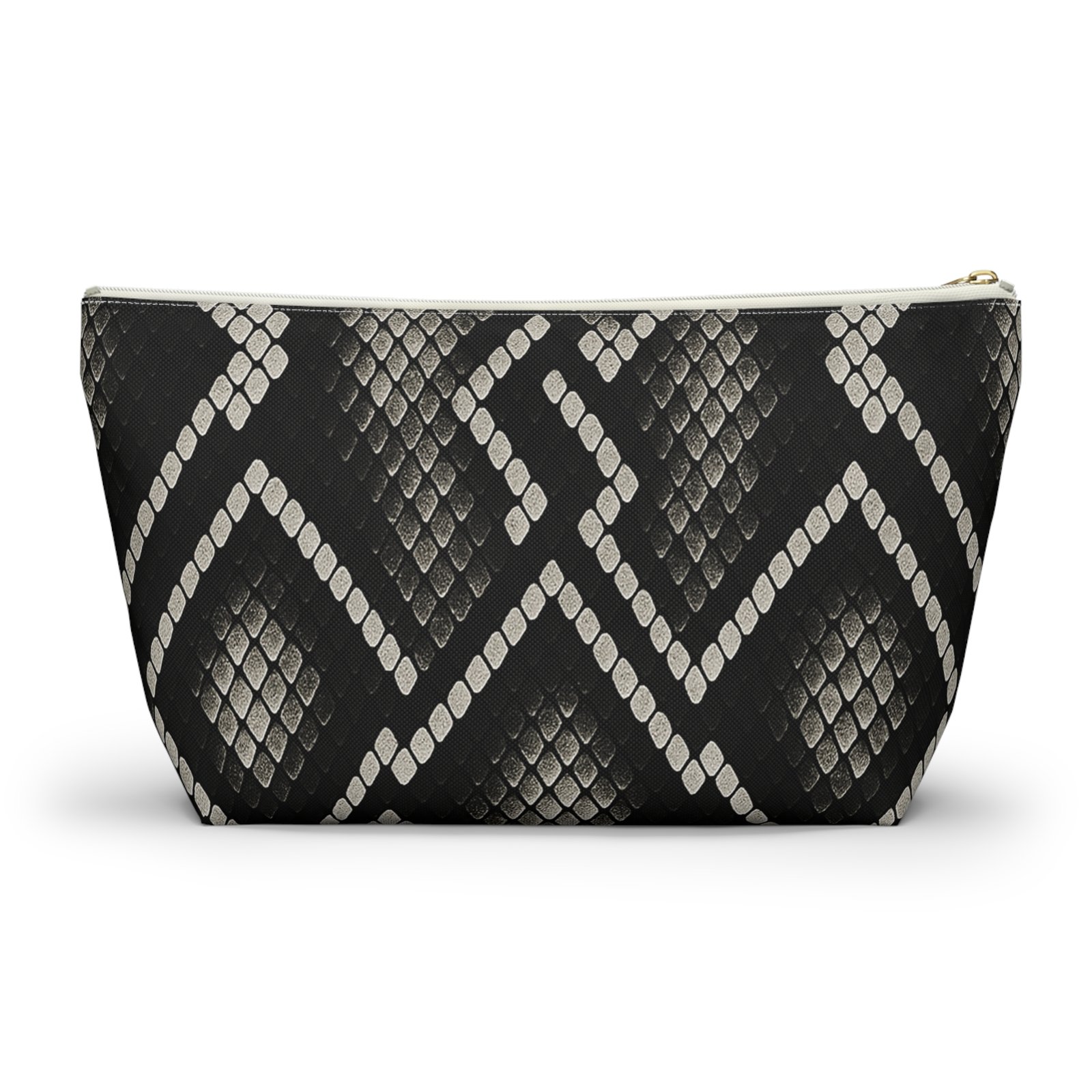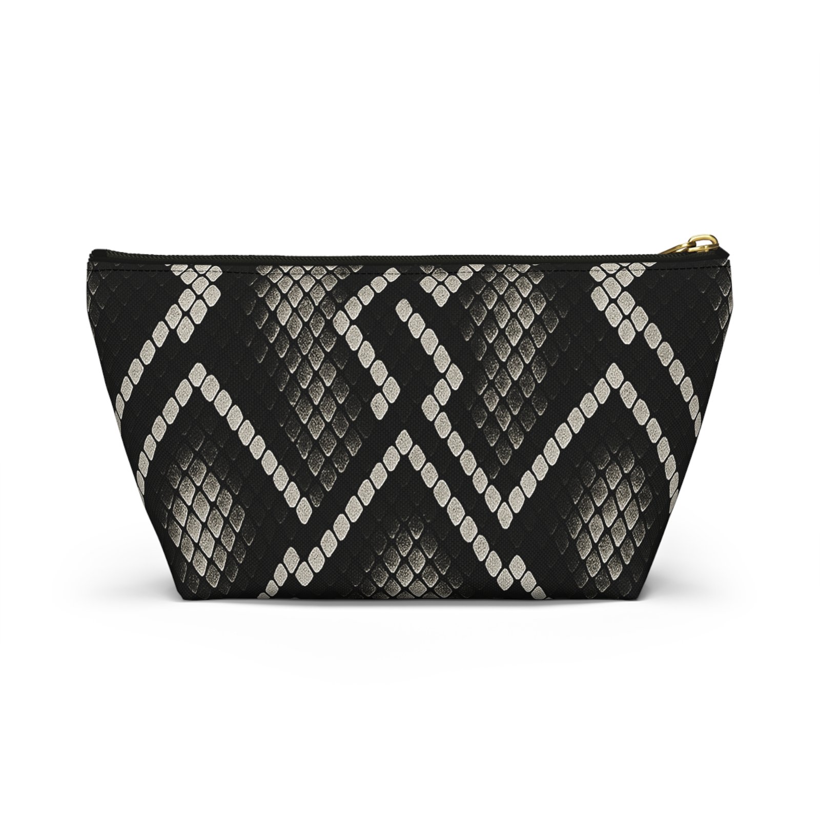 This tapered accessory pouch brings bold, textured style to everyday carry. The roomy T-bottom silhouette stands upright on counters and fits cosmetics, cords, or art supplies without tipping over. A monochrome snakeskin-inspired print gives it an edgy, modern look — matte black and soft gray scales create depth while the gold zipper pull adds a subtle luxe touch. Lightly structured polyester holds shape and resists wrinkles, and the laminated interior protects against spills and makes wiping quick and easy. Slip it into a tote or keep it on your vanity; it’s made to travel through your day with confidence and a quiet attitude.