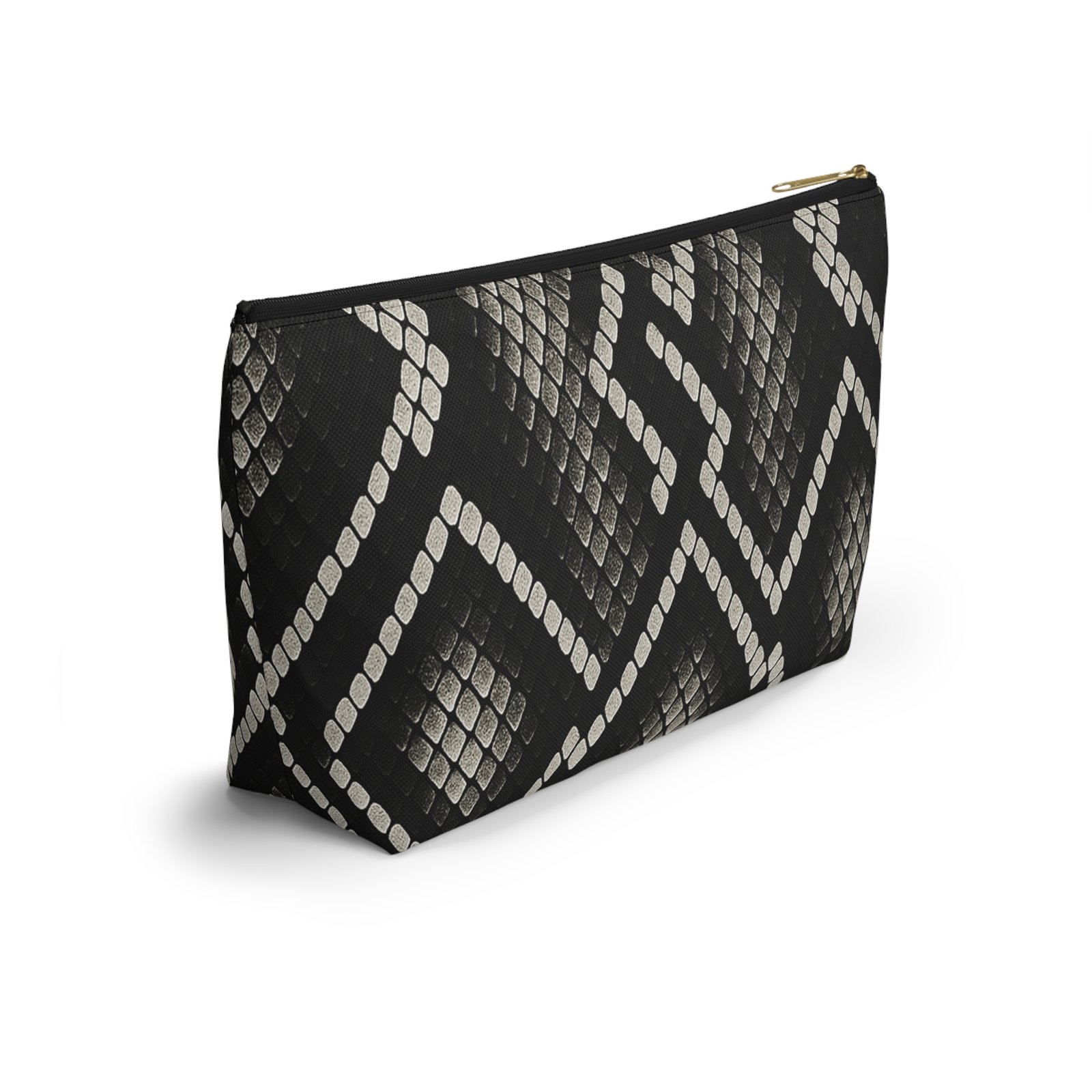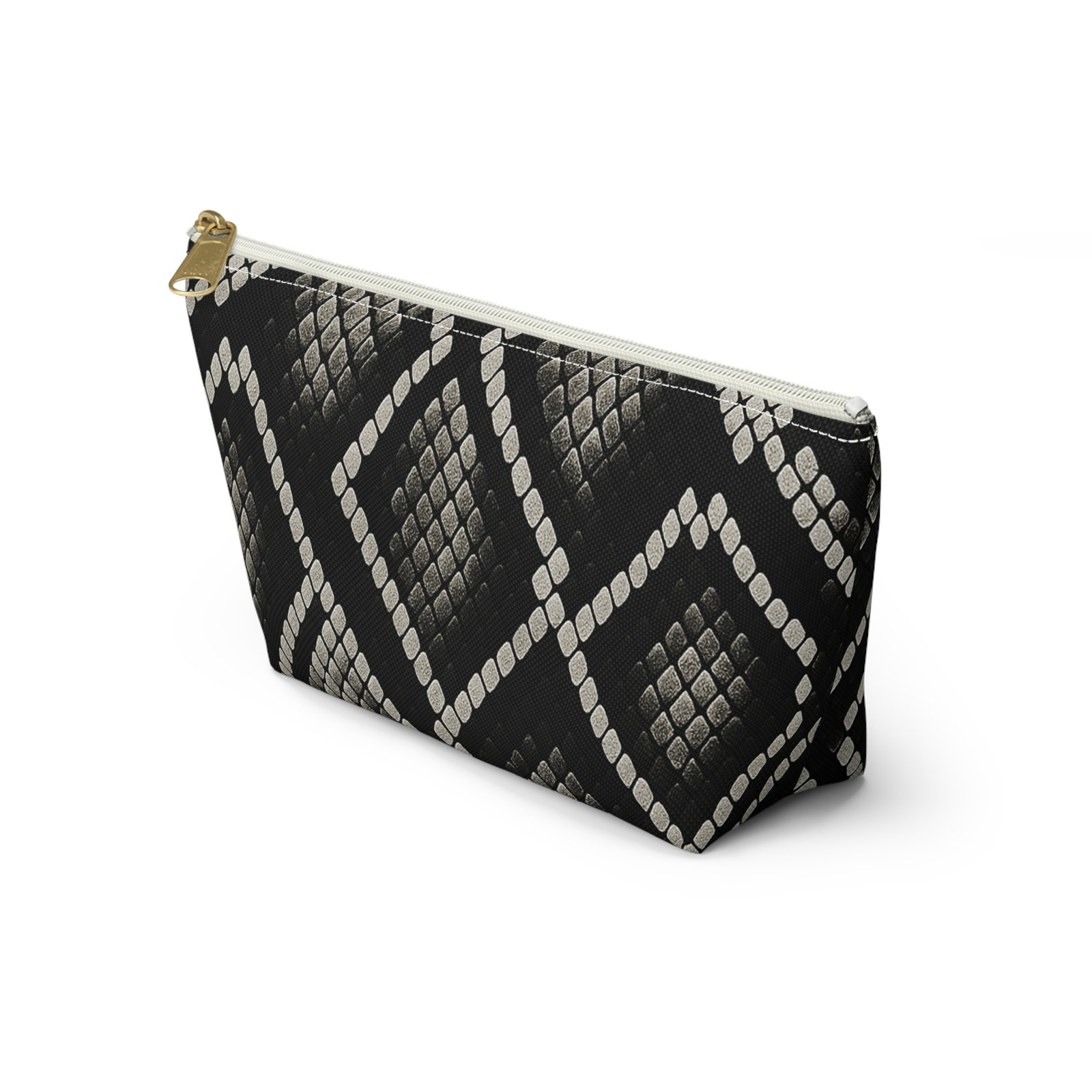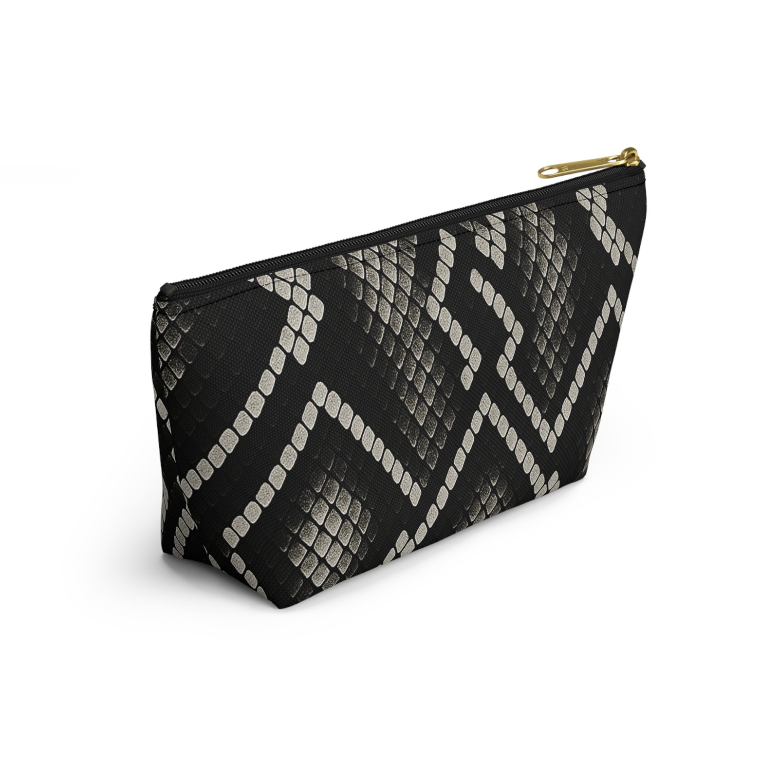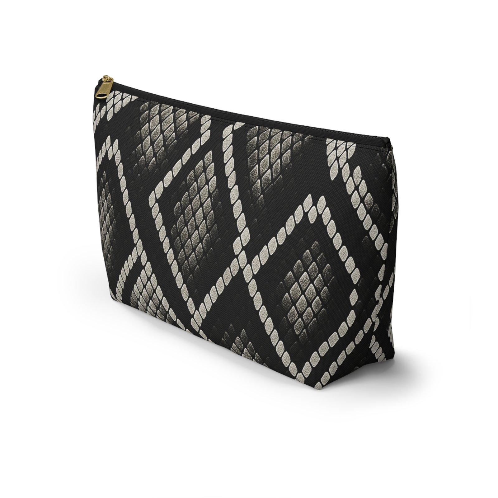 This tapered accessory pouch brings bold, textured style to everyday carry. The roomy T-bottom silhouette stands upright on counters and fits cosmetics, cords, or art supplies without tipping over. A monochrome snakeskin-inspired print gives it an edgy, modern look — matte black and soft gray scales create depth while the gold zipper pull adds a subtle luxe touch. Lightly structured polyester holds shape and resists wrinkles, and the laminated interior protects against spills and makes wiping quick and easy. Slip it into a tote or keep it on your vanity; it’s made to travel through your day with confidence and a quiet attitude.