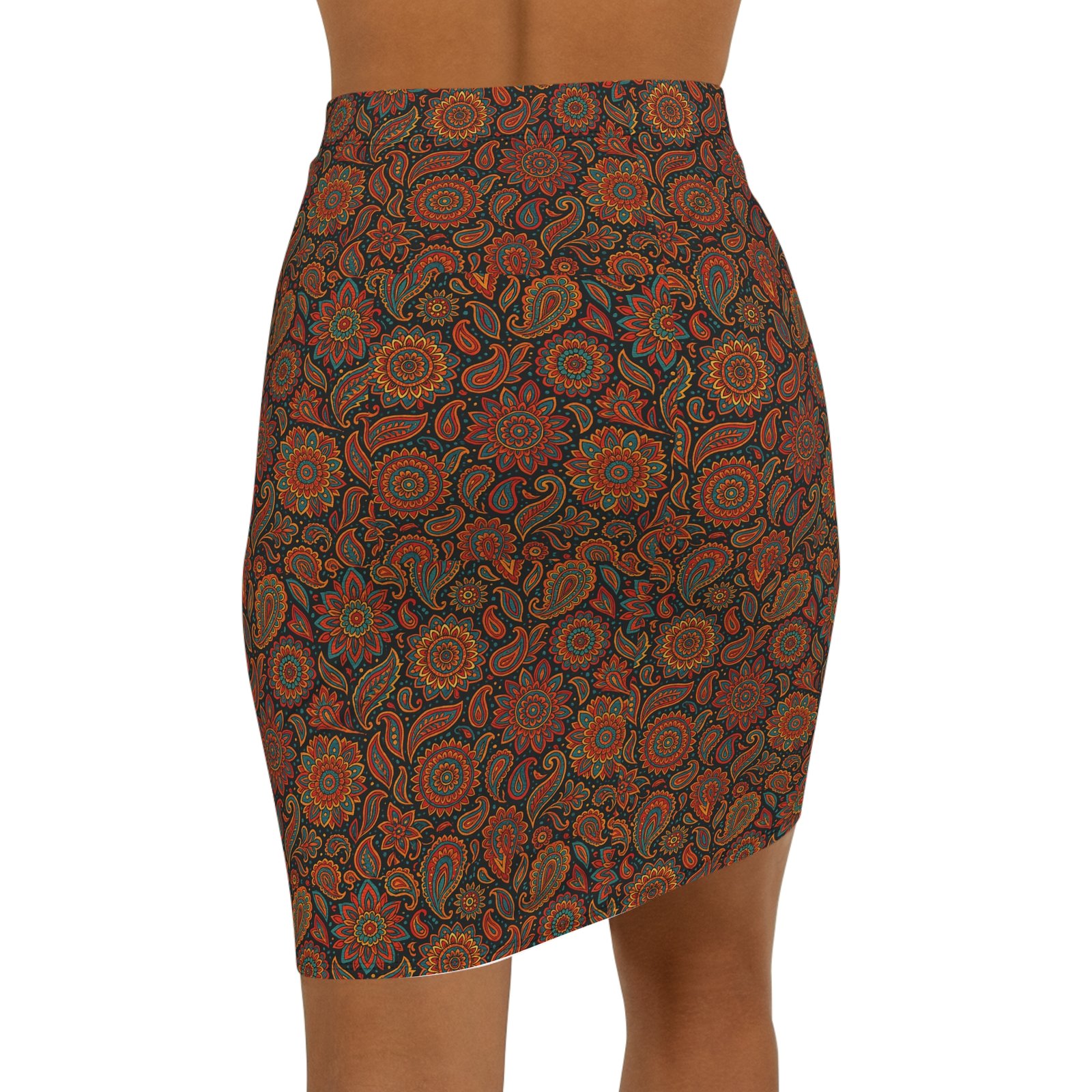 Bohemian Mid-Waist Patterned Skirt with vibrant colors and all-over print. Made from a blend of polyester and spandex for stretch and softness. Perfect for women who love bohemian fashion and want to stand out. Ideal for casual wear, festivals, and summer outings.