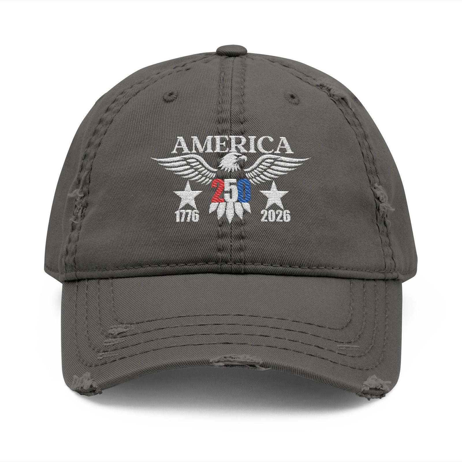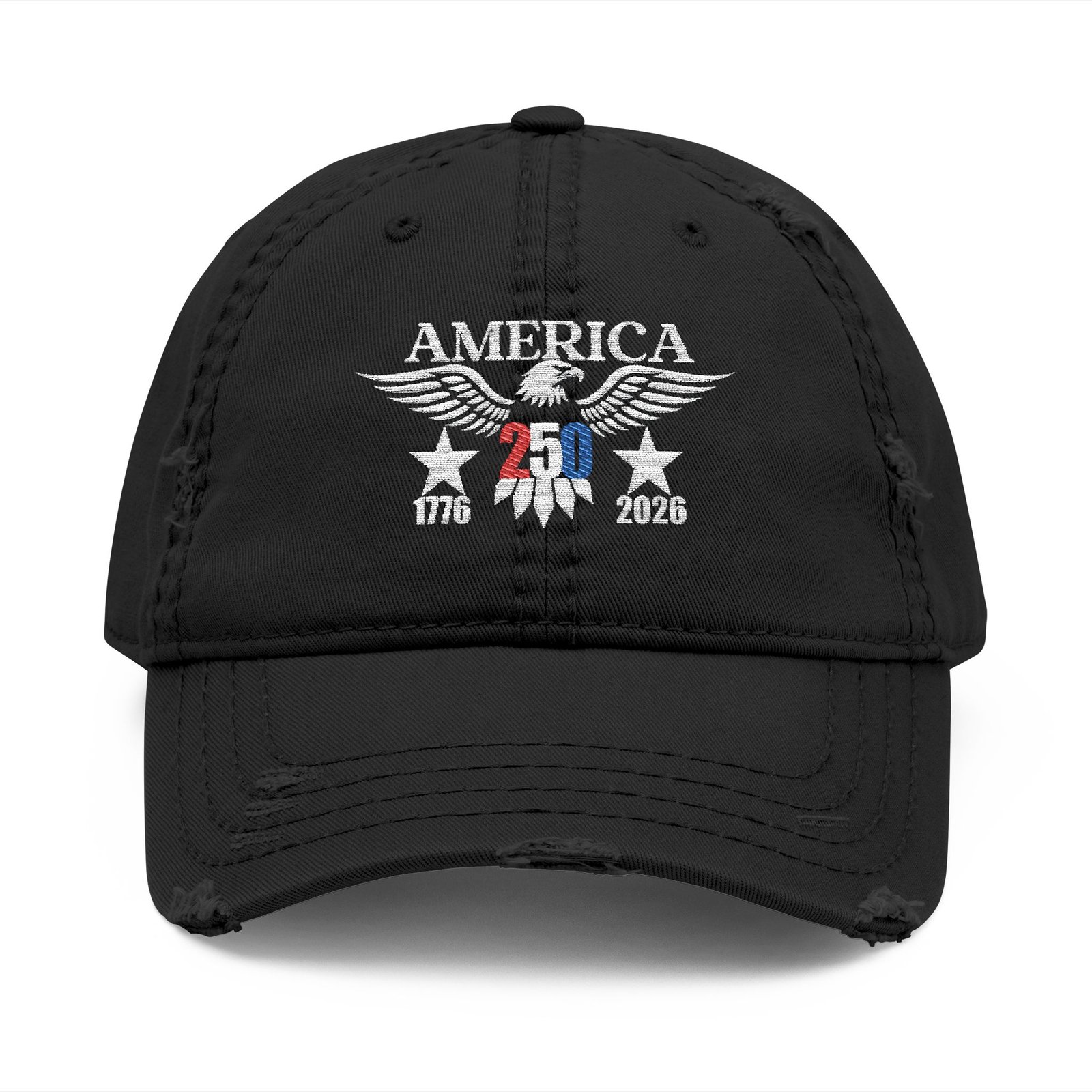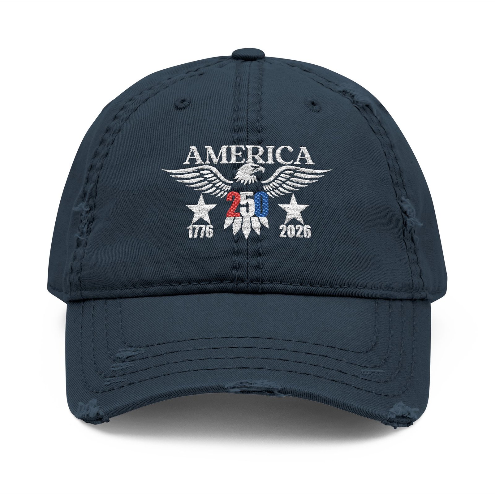 America 250 Distressed Dad Hat with Embroidered American Eagle celebrating America’s 250th Birthday. This hat gives a patriotic vibe and is perfect for anyone looking to show their pride for America’s milestone celebration. Great for Fourth of July, patriotic holidays, and everyday wear.