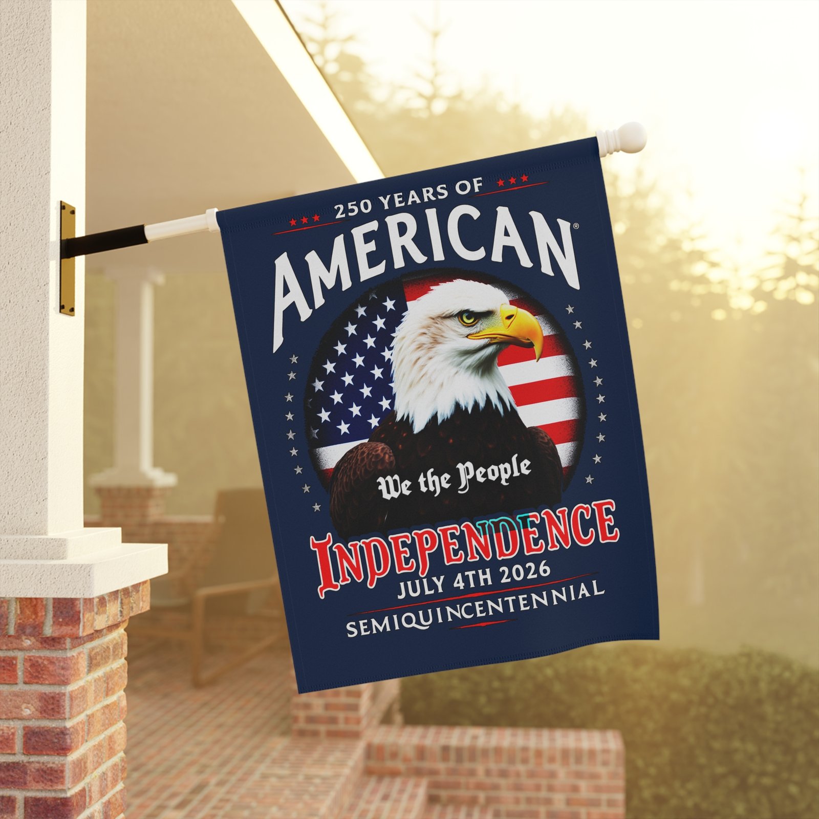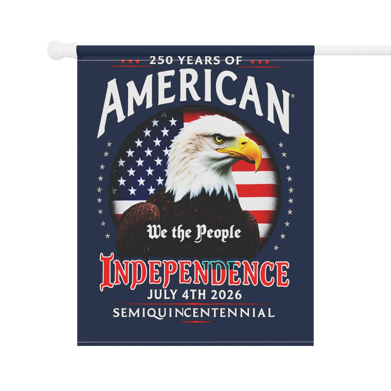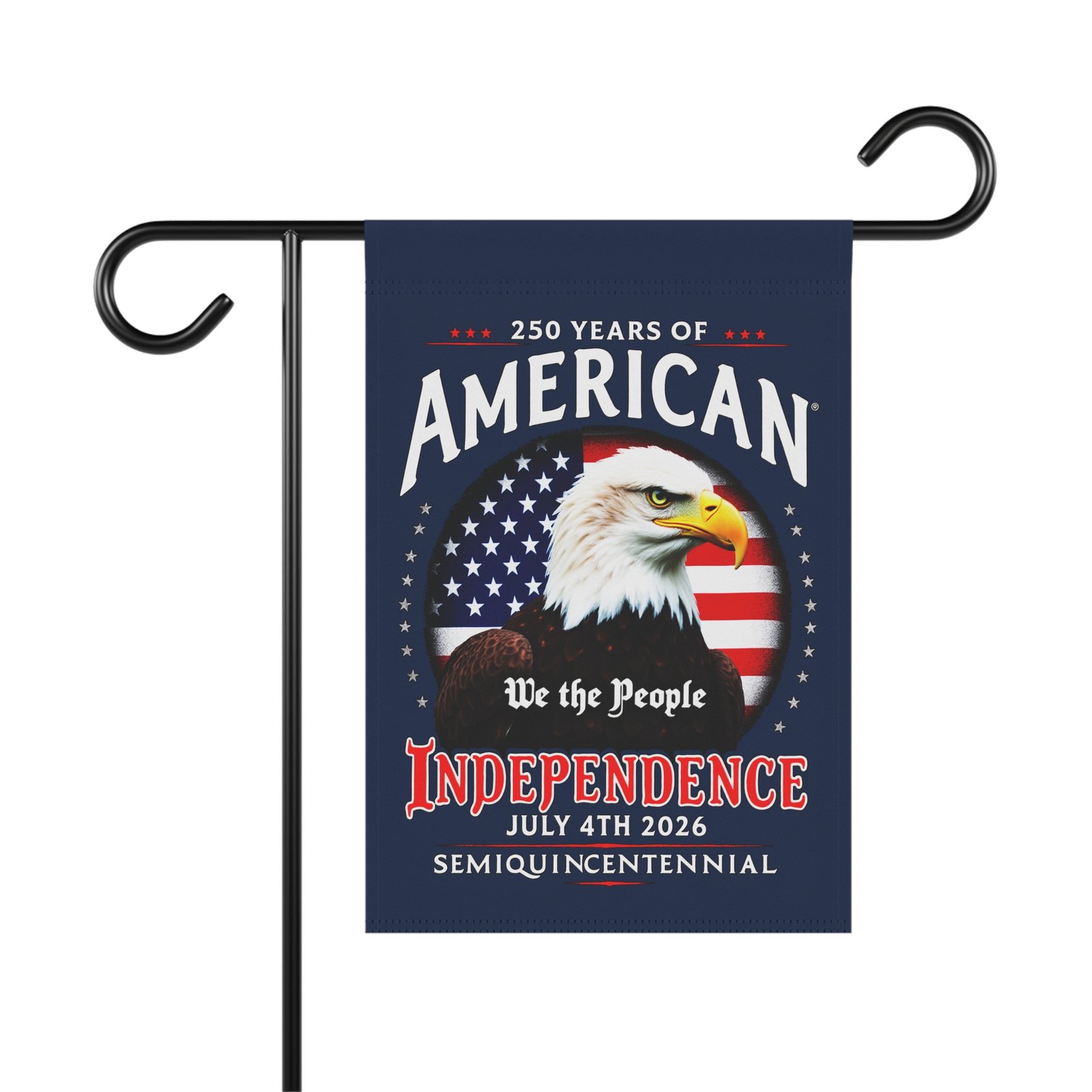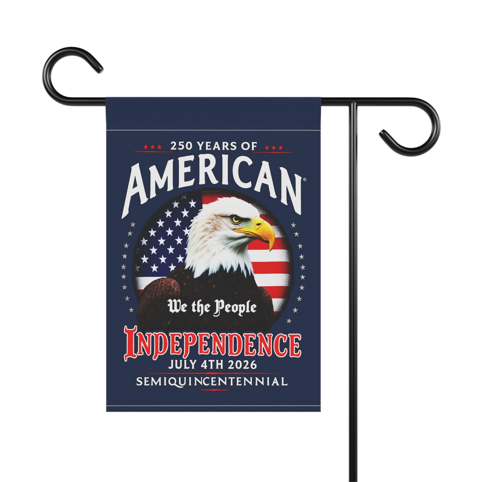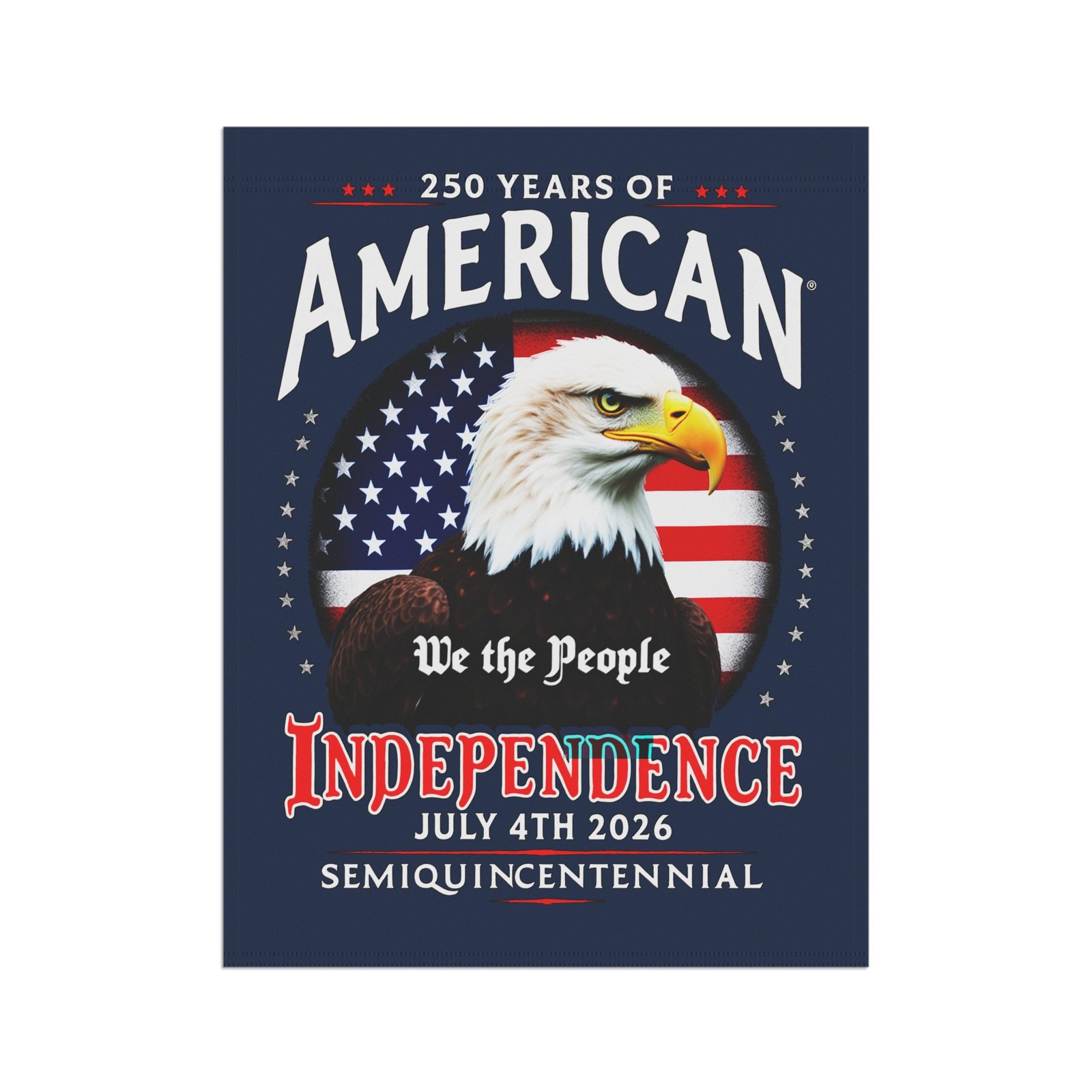 This patriotic flag Banner celebrates 250 Years of America Semiquincentennial with a vibrant Old Glory Blue background. Perfect for adding a touch of patriotism to your garden or house, this banner is ideal for those who love to display their American pride. Great for Memorial Day, Fourth of July, Veterans Day, and other patriotic observances.