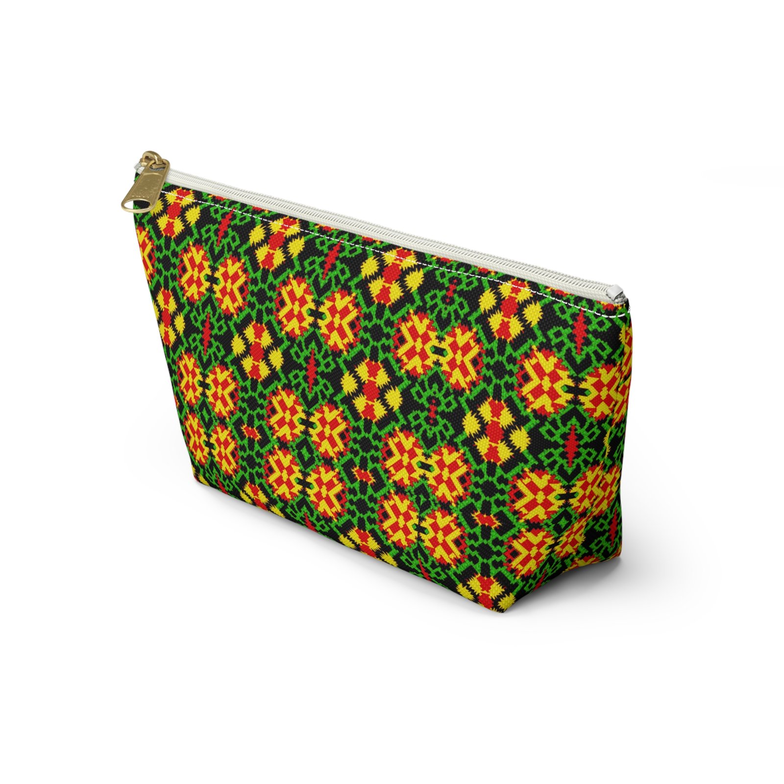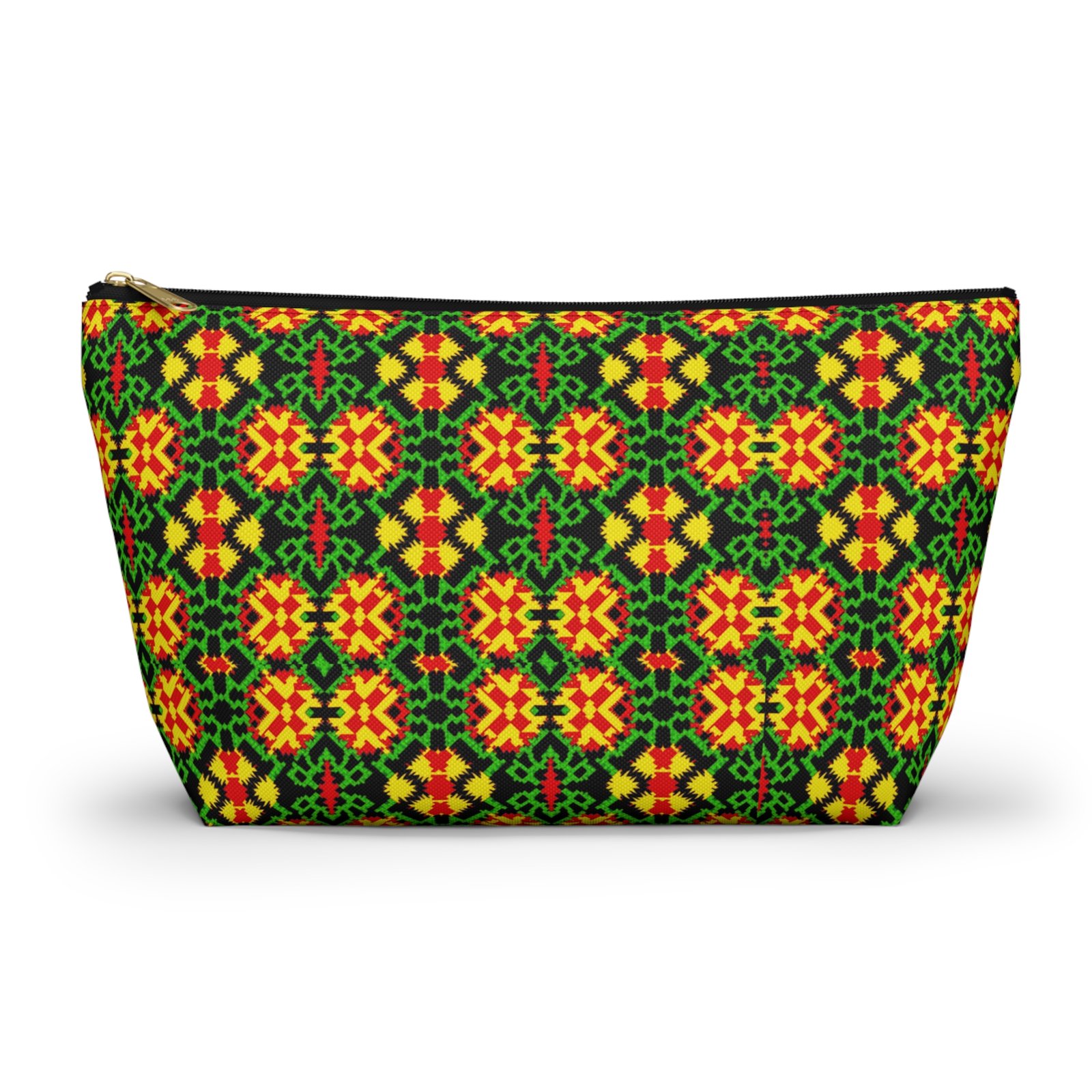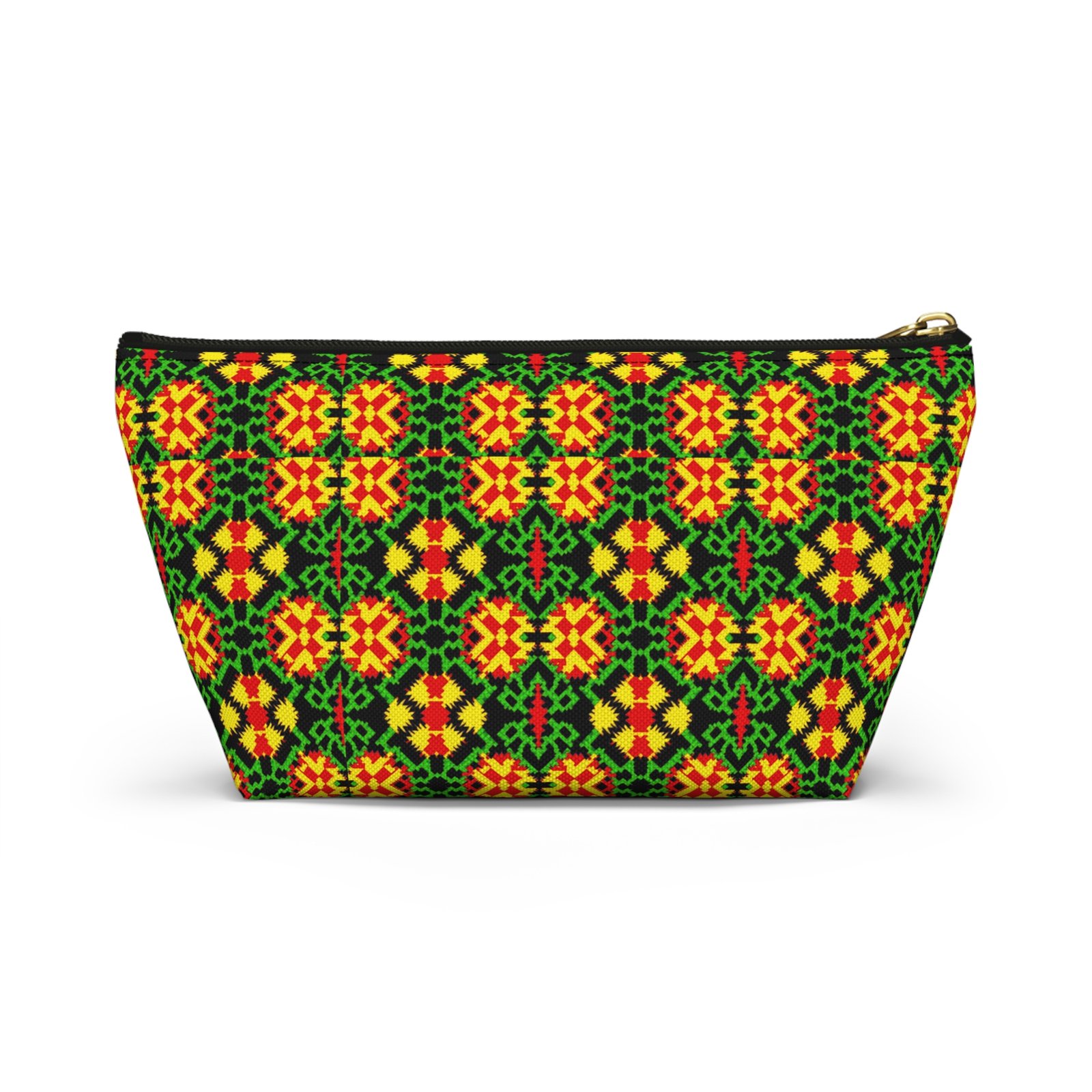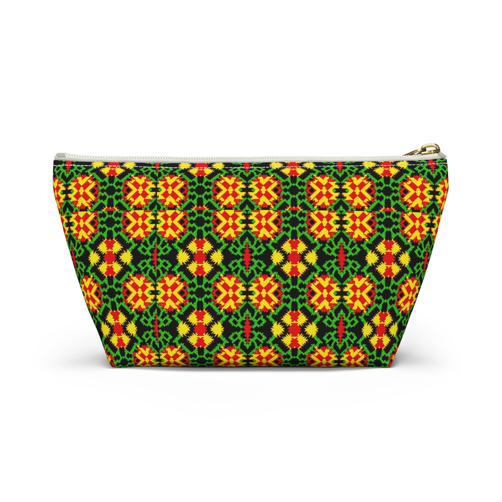Bright, patterned accessory pouch that brings a cozy, folk-art energy to everyday carry. The structured T-bottom keeps it standing on a counter while the roomy interior holds makeup, small tools, or travel essentials. Warm reds and golds pop against deep greens in a repeating motif that nods to traditional textile patterns without feeling dated. The sturdy zipper with a gold puller closes securely, and the laminated lining helps protect contents from spills and makes clean-up easy. This pouch lives on bathroom shelves, in tote bags, and on bedside dressers — a small, lively piece that adds color and order to daily routines.