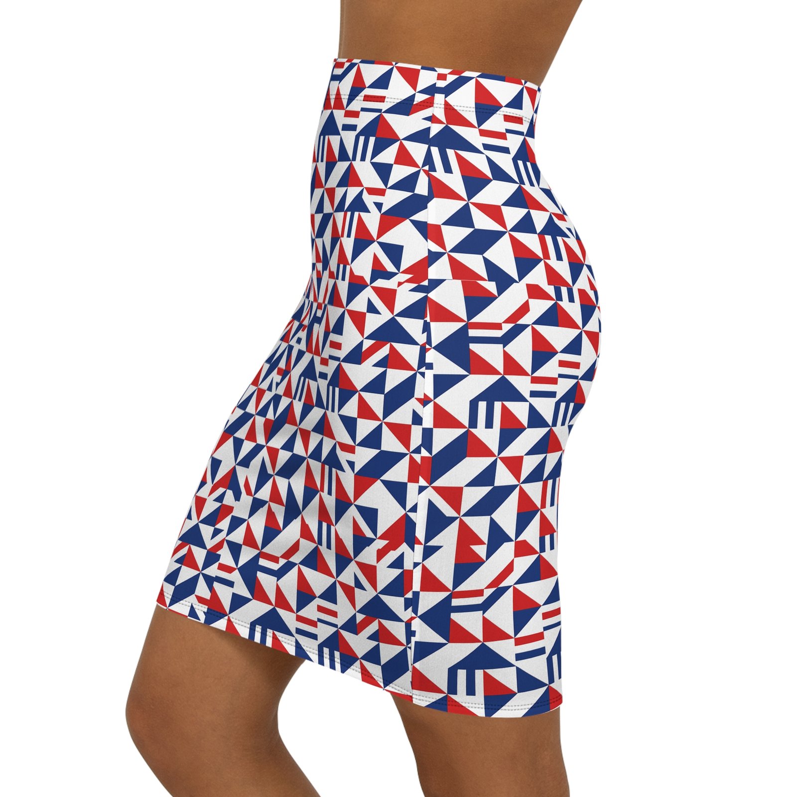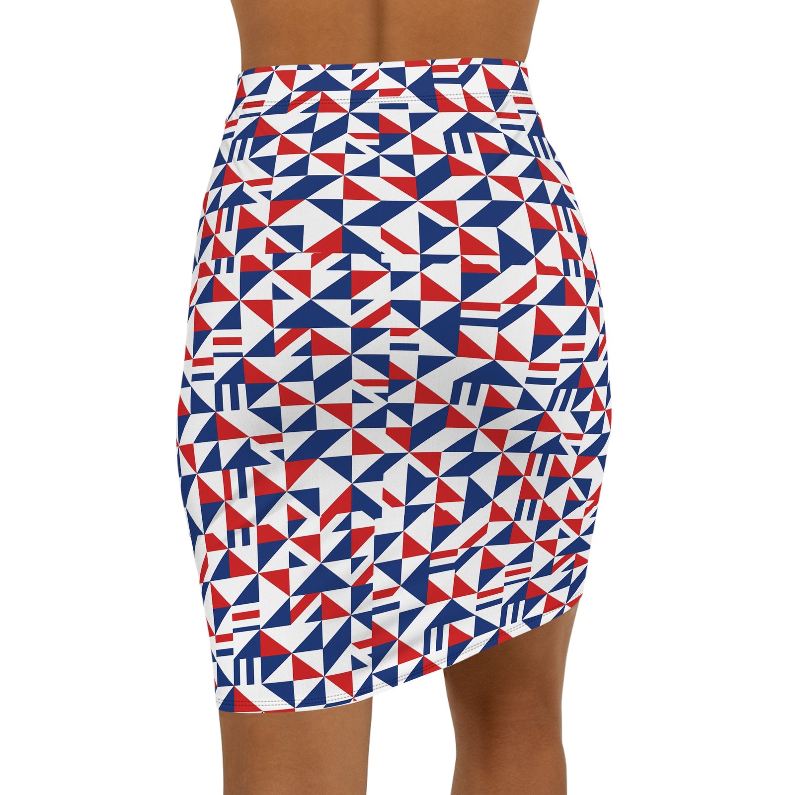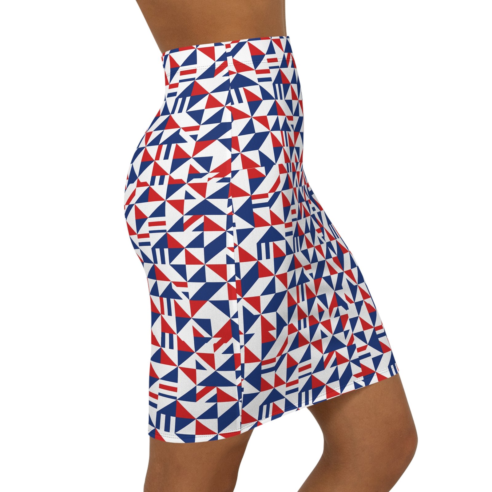 This Red White Blue Geometric Triangle Print Pencil Skirt is a stylish addition to any woman’s wardrobe. The vibrant colors and eye-catching design give off a modern and trendy vibe, perfect for the fashion-forward individual. It is relevant for patriotic holidays, summer events, and casual outings.
