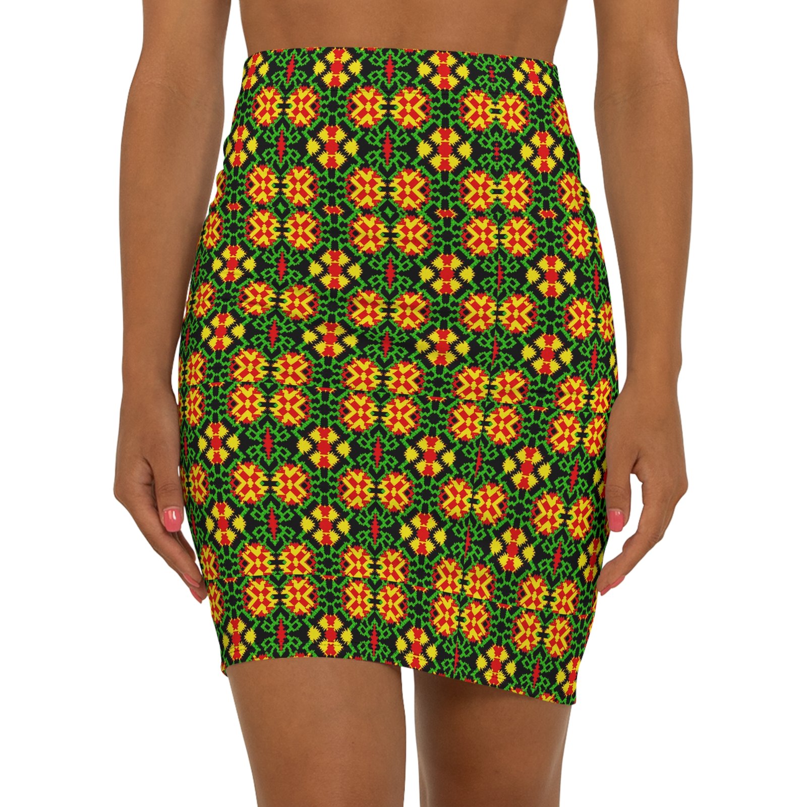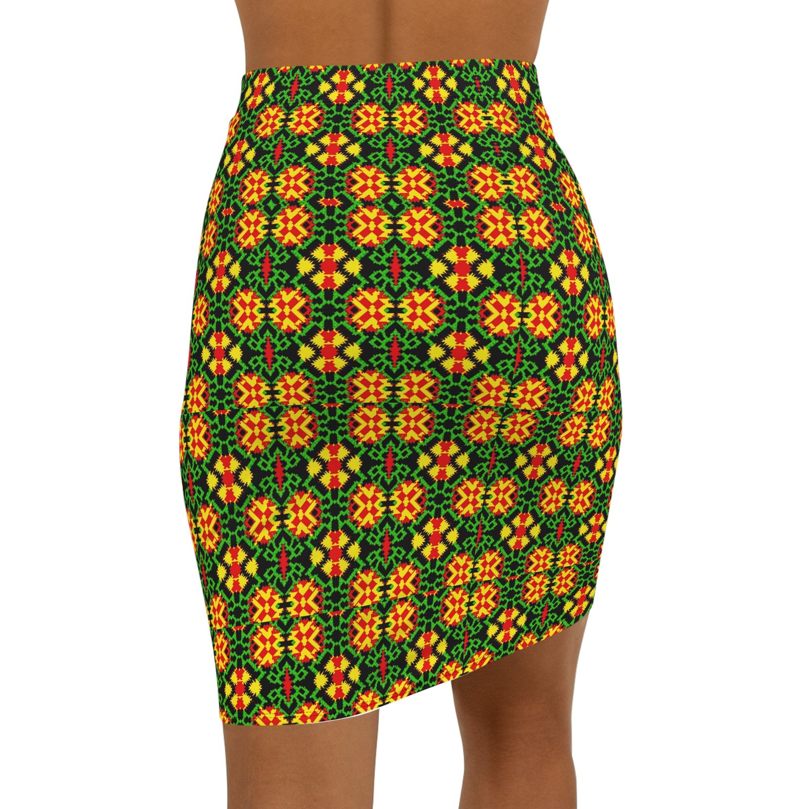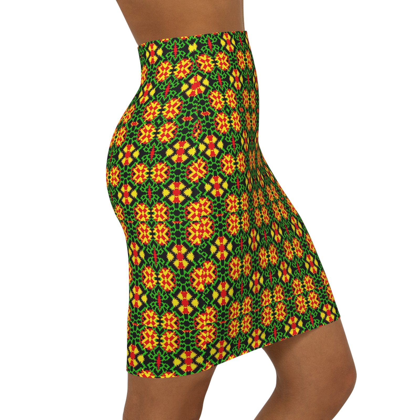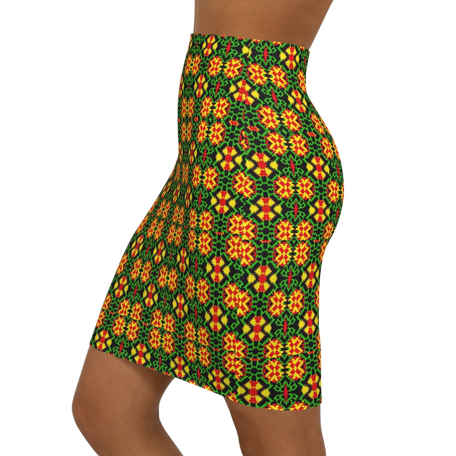 A lively mid-waist pencil skirt patterned with a bold, kaleidoscopic mosaic in warm oranges, sunny yellows and deep greens. The slim silhouette hugs curves while a soft elastic waistband keeps things comfortable for all-day wear. The all-over print gives a continuous, handcrafted look that reads like a modern folk textile — wearable art that moves from coffee dates to gallery nights. Lightweight stretch fabric lets you sit, walk and dance without restriction. Wear it with a simple tee and boots for an effortless street-to-studio outfit, or pair with a tailored blouse for a more polished evening vibe.