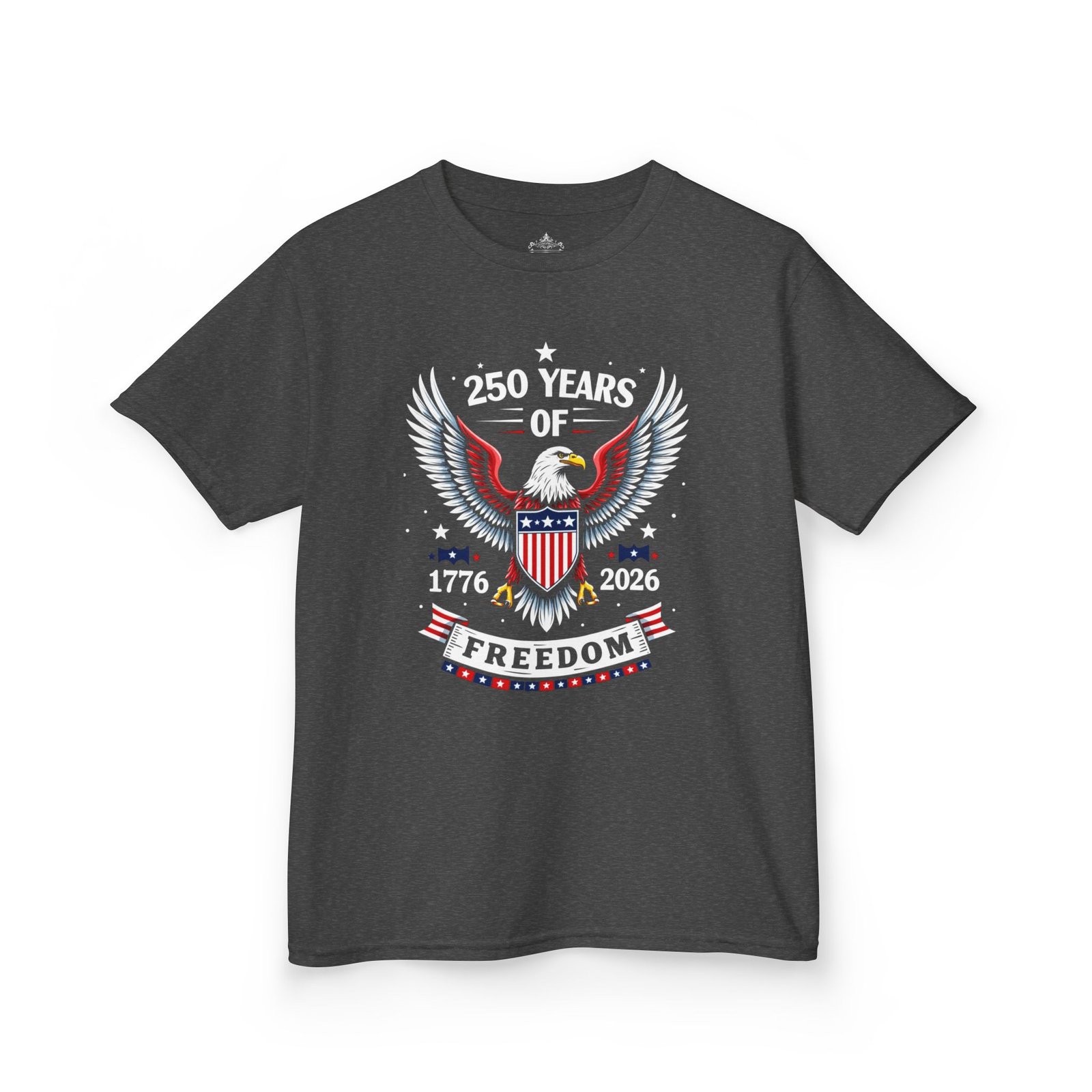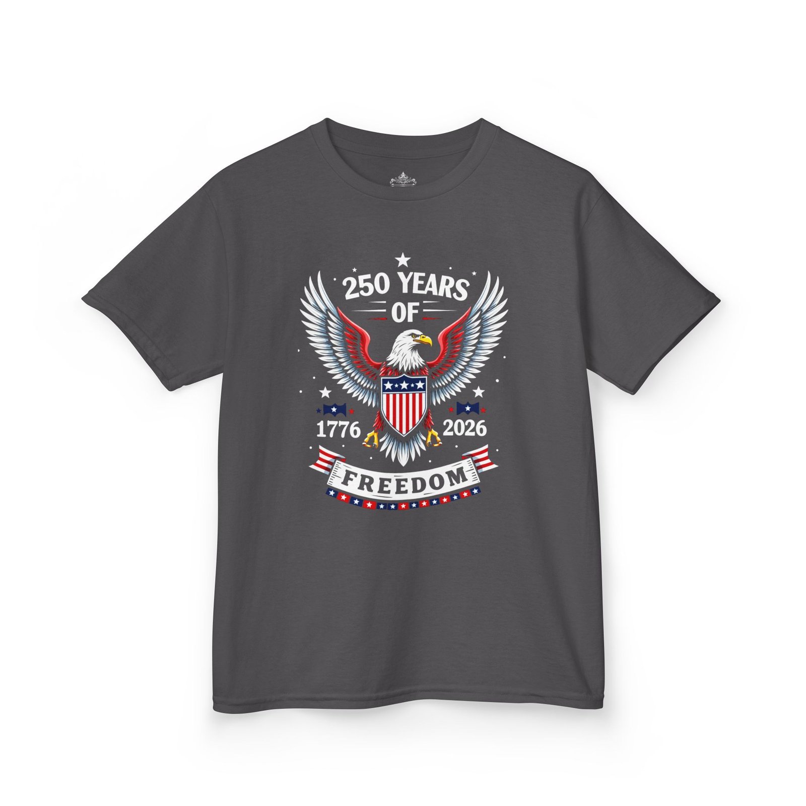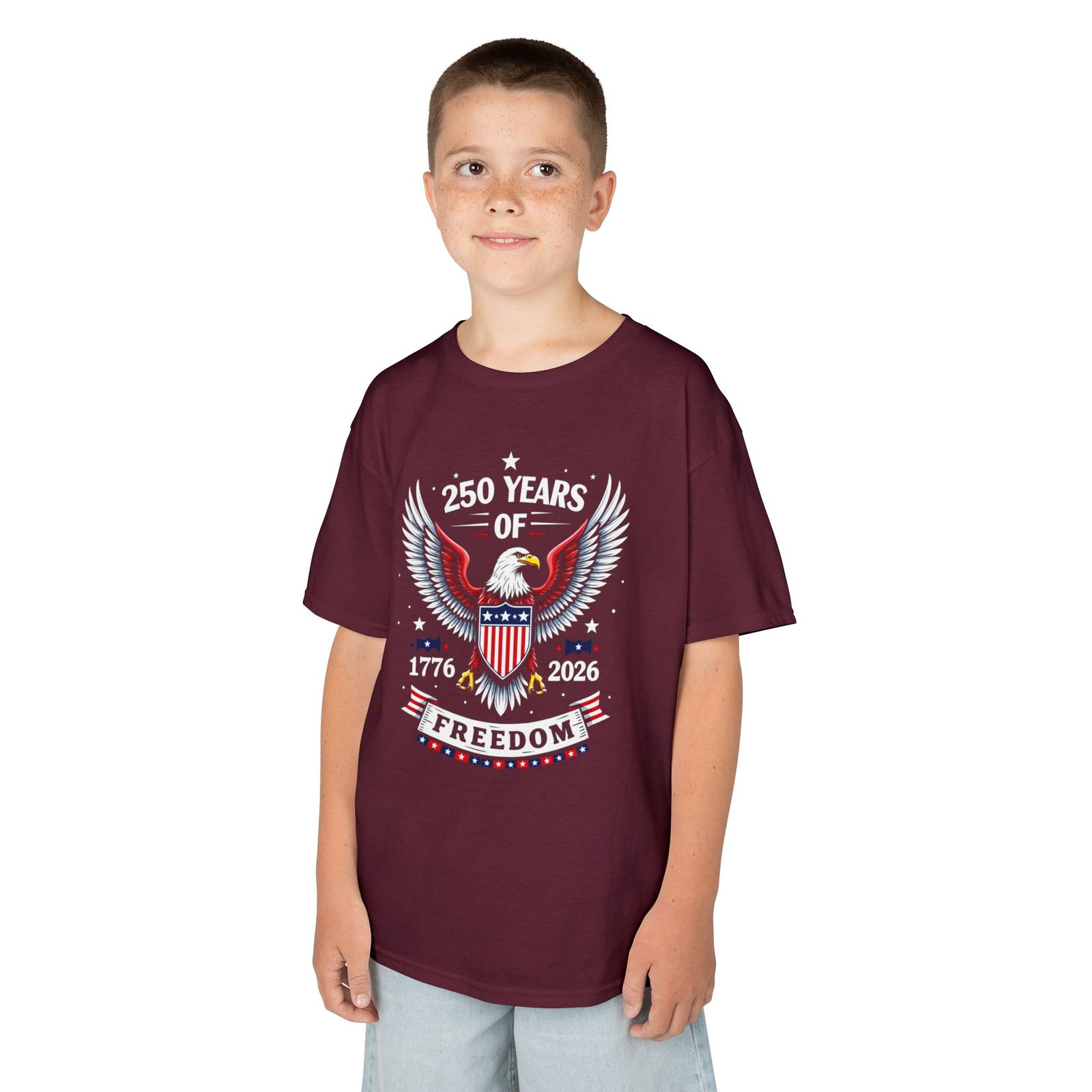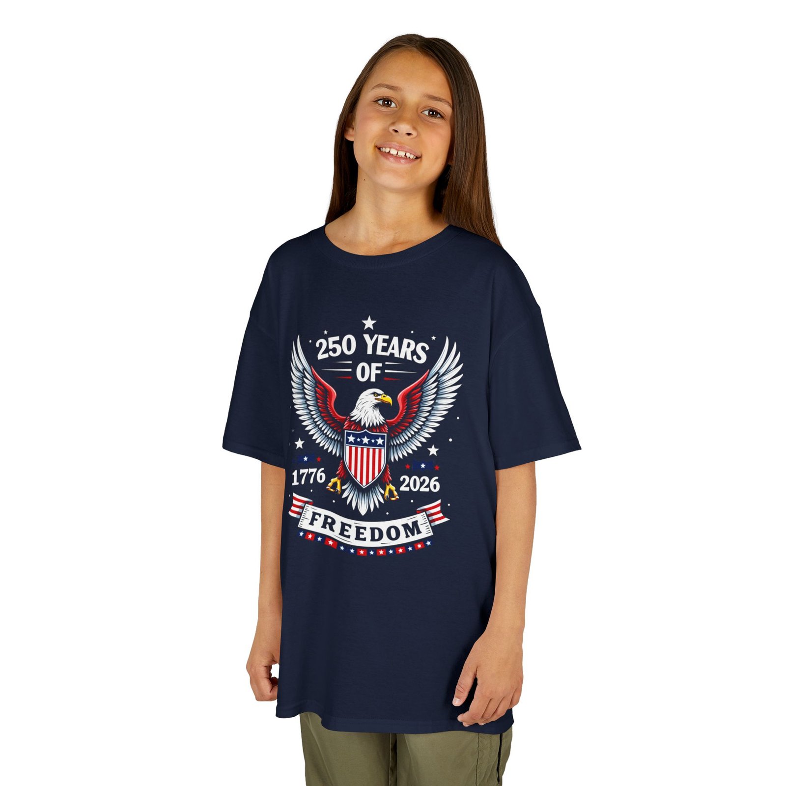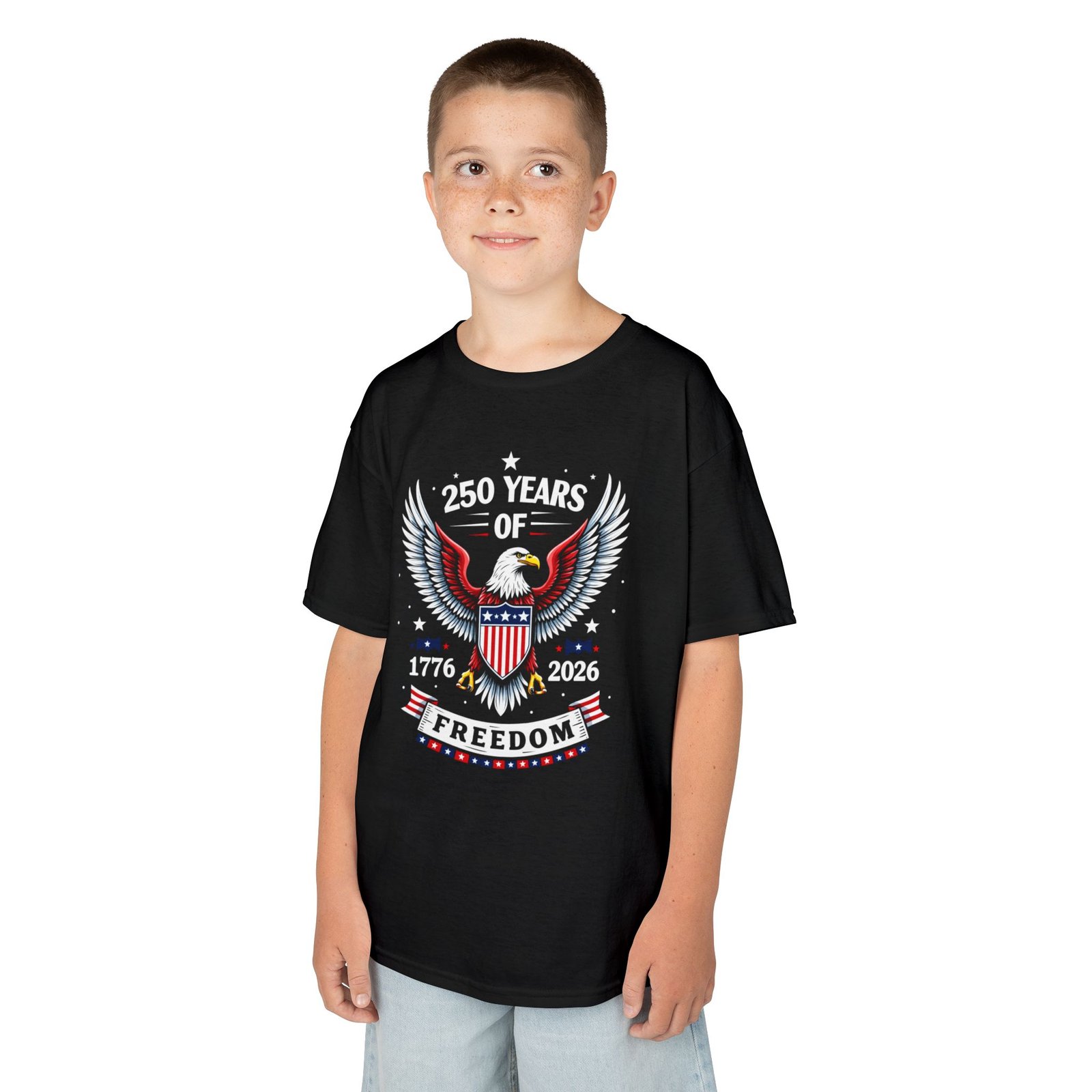 Honor a historic milestone with the Kids Patriotic Freedom Tee – Celebrate 250 Years! Featuring bold red, white, and blue graphics with 1776–2026, this youth t-shirt is a fun and meaningful way for kids to join in the America 250 Semiquincentennial celebration. Perfect for Independence Day, school history projects, parades, and family gatherings, this comfortable shirt lets young patriots proudly wear their American spirit.