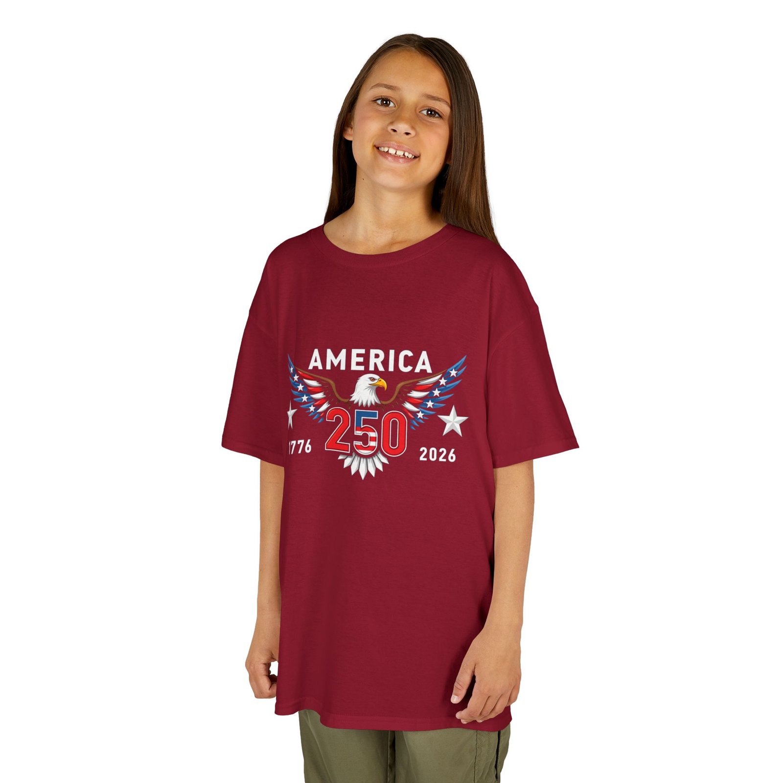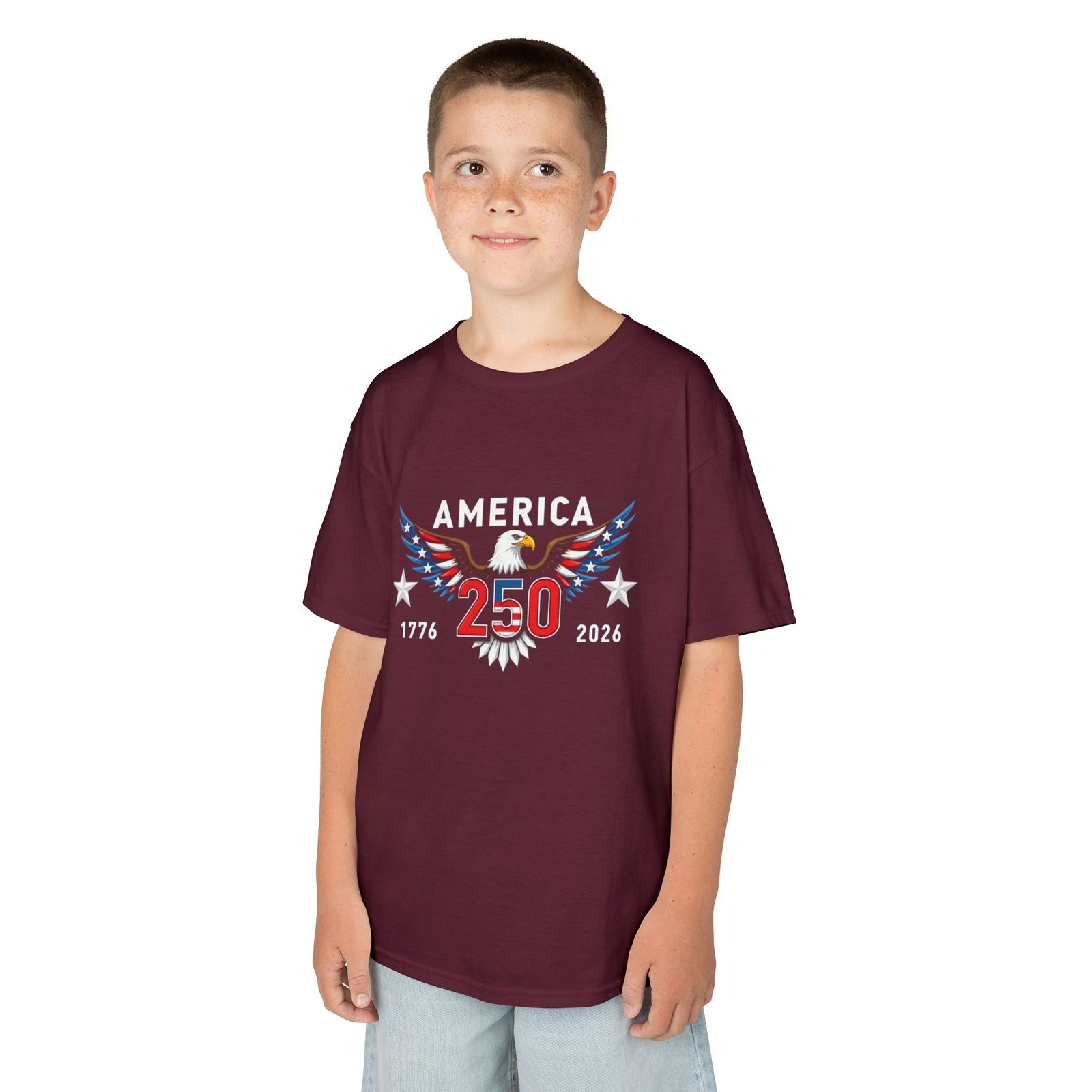Celebrate a once-in-a-lifetime milestone with the Kids Patriotic Tee – 250th America Anniversary! Featuring bold red, white, and blue graphics with the dates 1776–2026, this youth t-shirt commemorates the United States’ Semiquincentennial in style. Perfect for Independence Day, school history events, family reunions, or America 250 parades, this comfortable tee is the ideal way for kids to wear their patriotic pride.