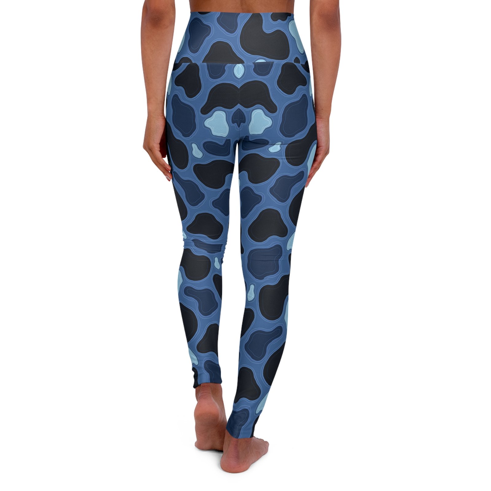 Patina blue army-pattern leggings shaped for movement and everyday wear. These high-waisted yoga leggings sit above the hips with a double-layer waistband that smooths and holds without digging in. The all-over patina camo print wraps the legs in muted blue-green tones, faded edges, and worn-in texture — a design that reads lived-in rather than loud. The fabric is a sturdy polyester-spandex blend with excellent four-way stretch, so poses, runs, and long days at the studio move with you. Visible stitching is color-matched on the outside for a clean look; seams inside remain white. Note the fabric can be slightly sheer when stretched in certain areas. Assembled in the USA from globally sourced parts, these leggings blend utility, subtle military-inspired style, and comfortable support for movement or layered casual outfits.