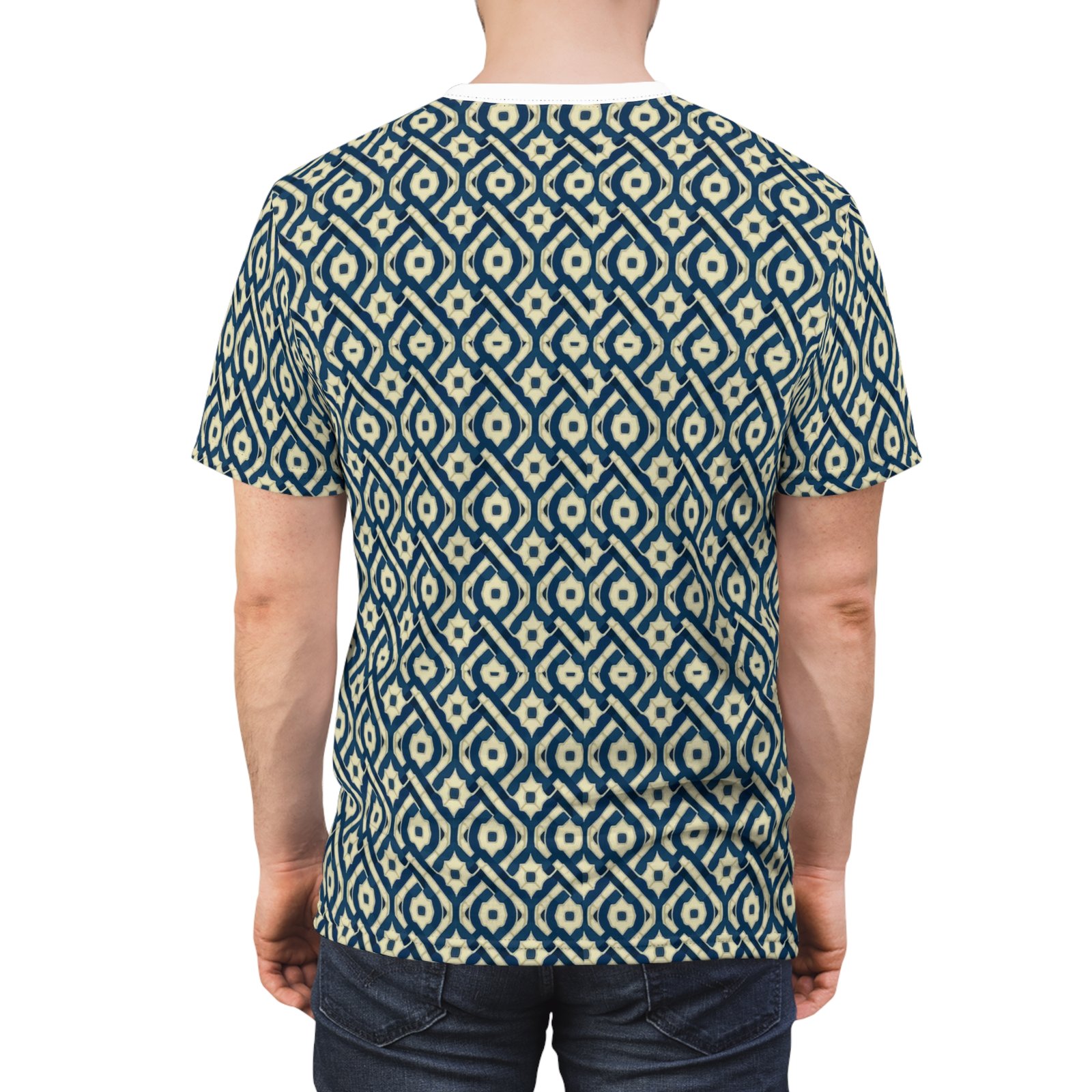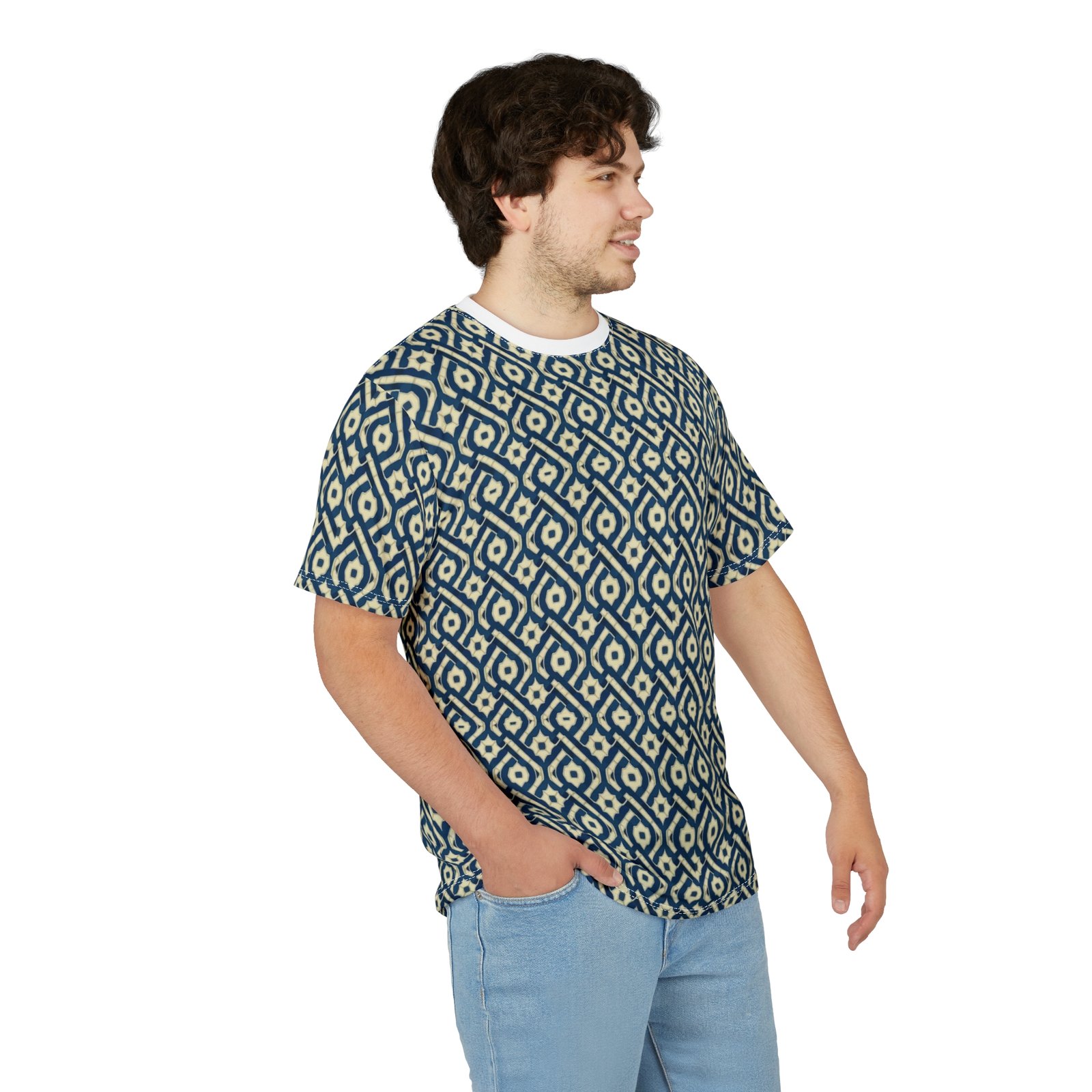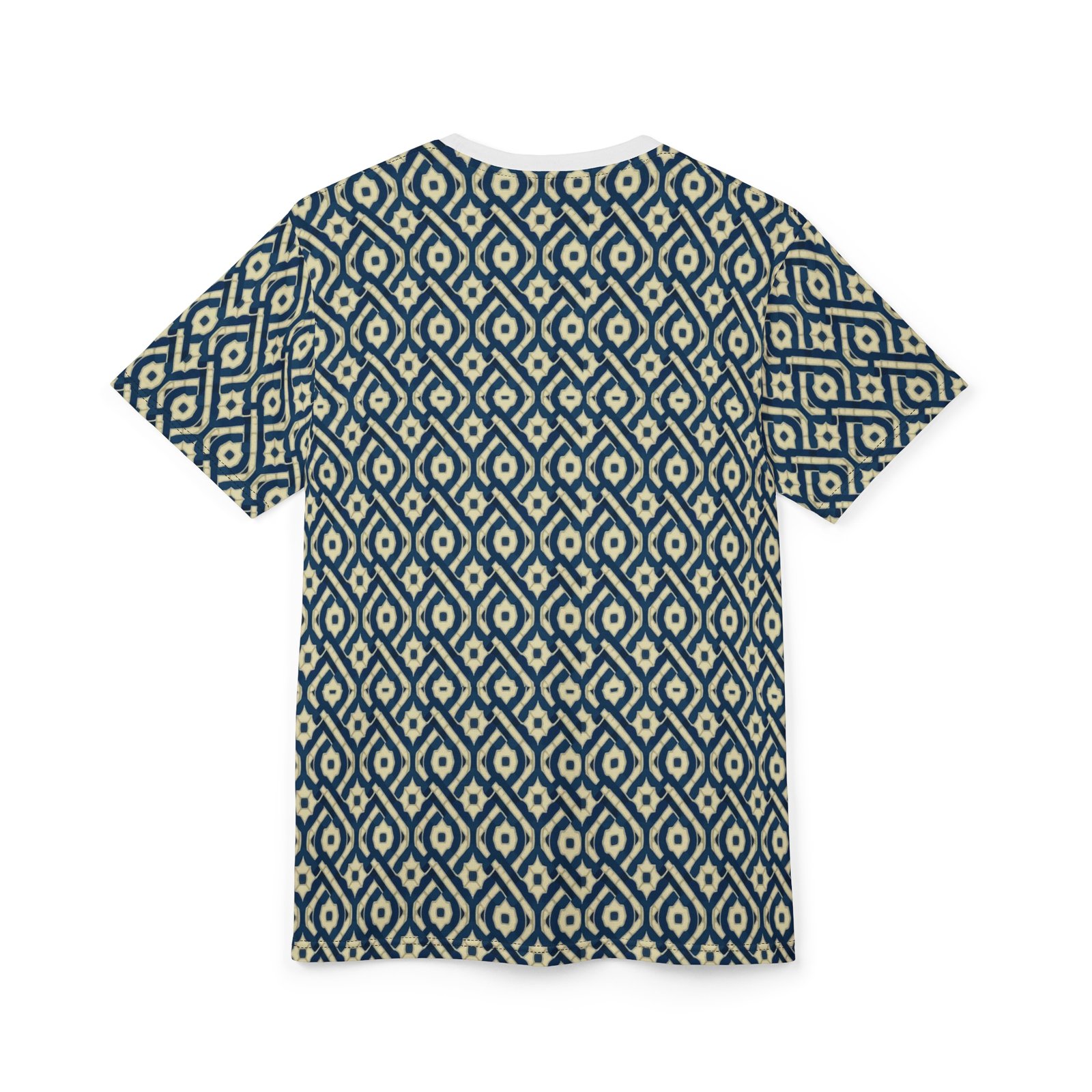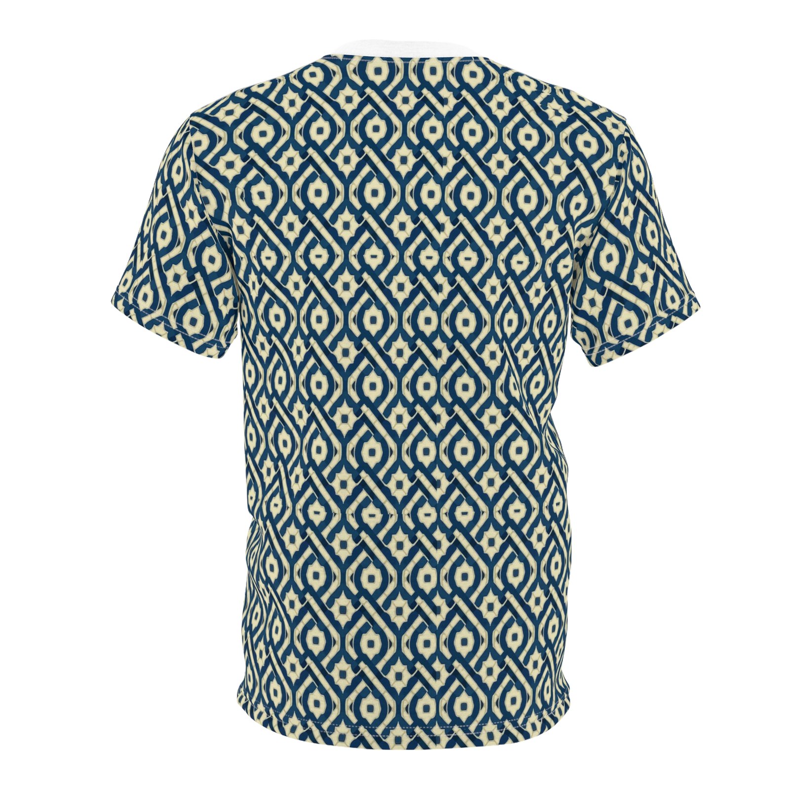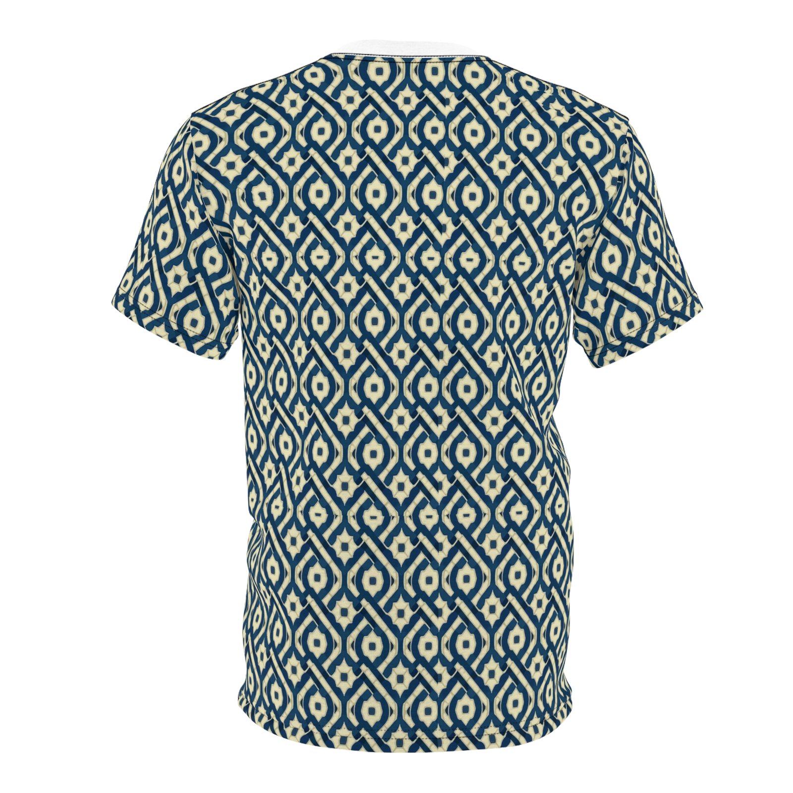 This all-over printed tee carries a handwoven-ikat vibe in deep indigo and warm cream, turning everyday wear into a textured, artisanal statement. Lightweight but durable polyester holds the intricate diamond pattern edge-to-edge, so the design flows across sleeves and body without breaks. The ribbed collar and shoulder tape keep the silhouette tidy after repeated wear, while the regular fit and tagless finish make it comfortable for long days—from gallery openings to weekend walks through the market. It feels like a well-traveled textile folded into a modern tee: familiar, textured, and quietly expressive.