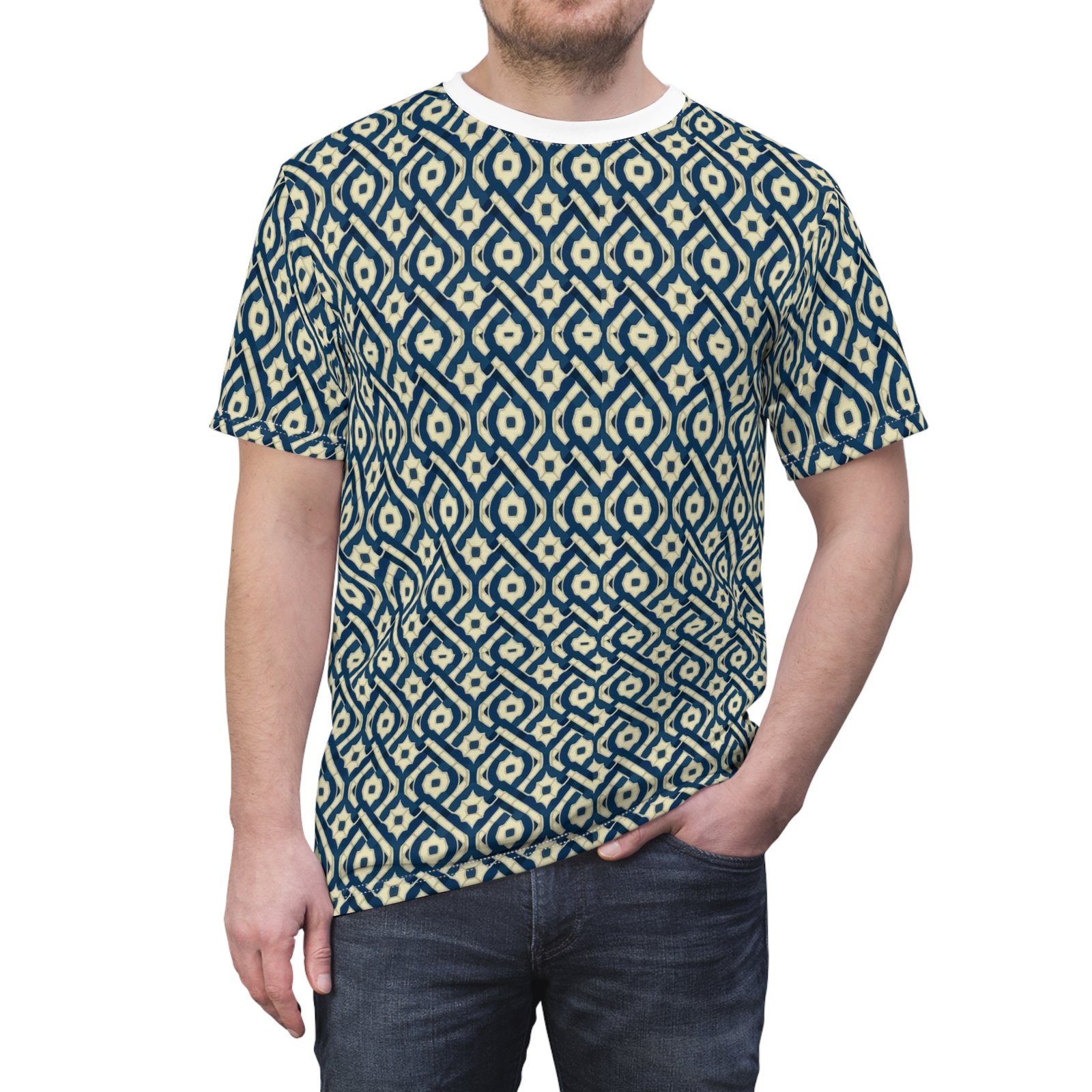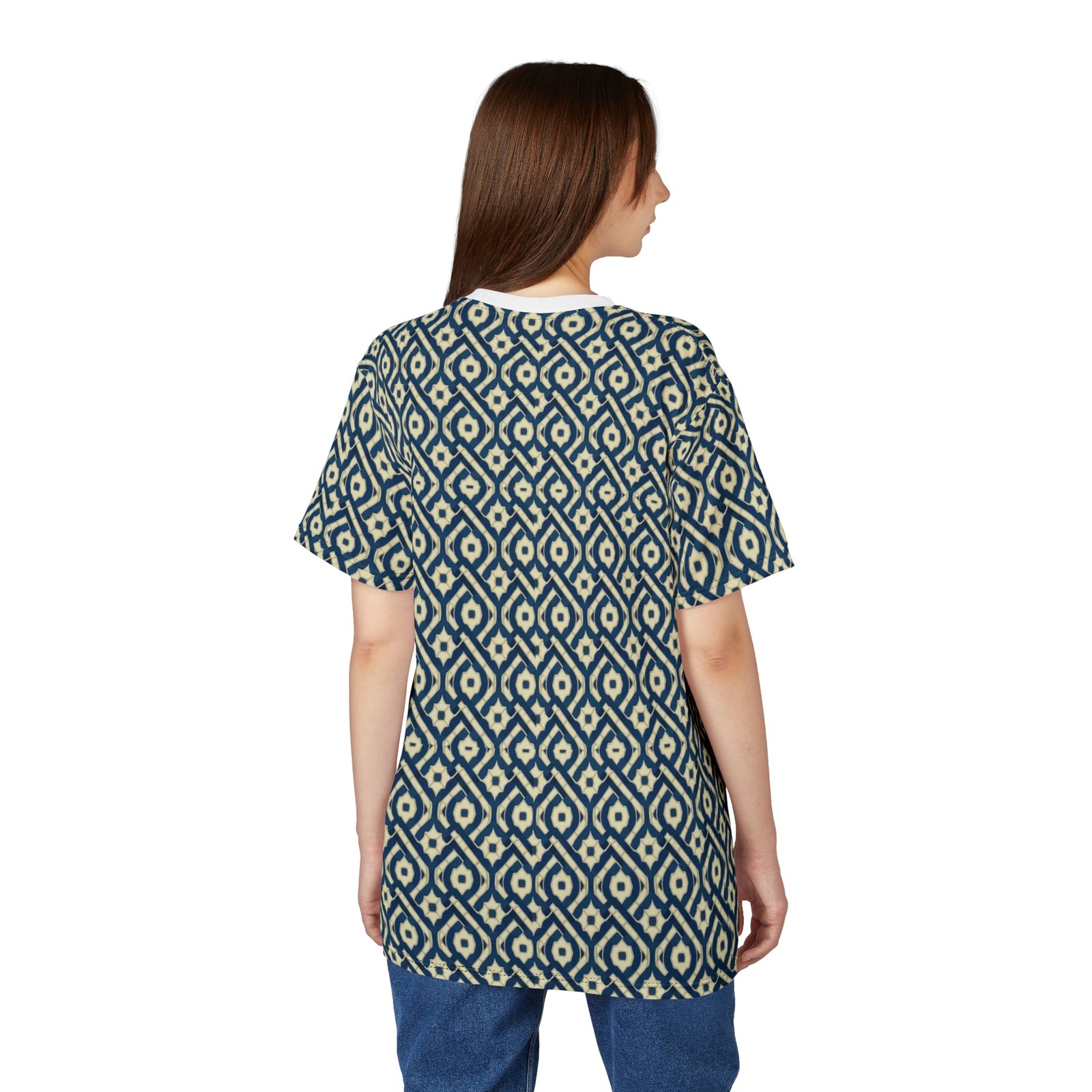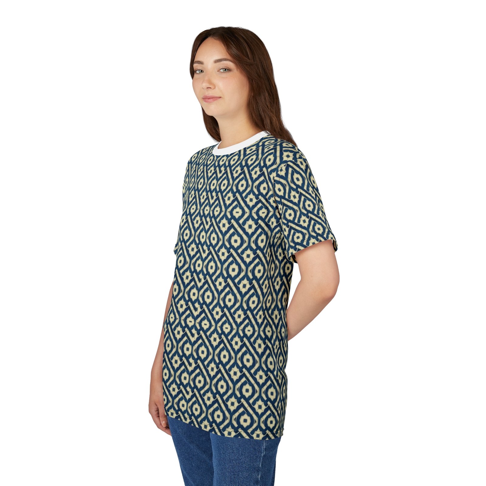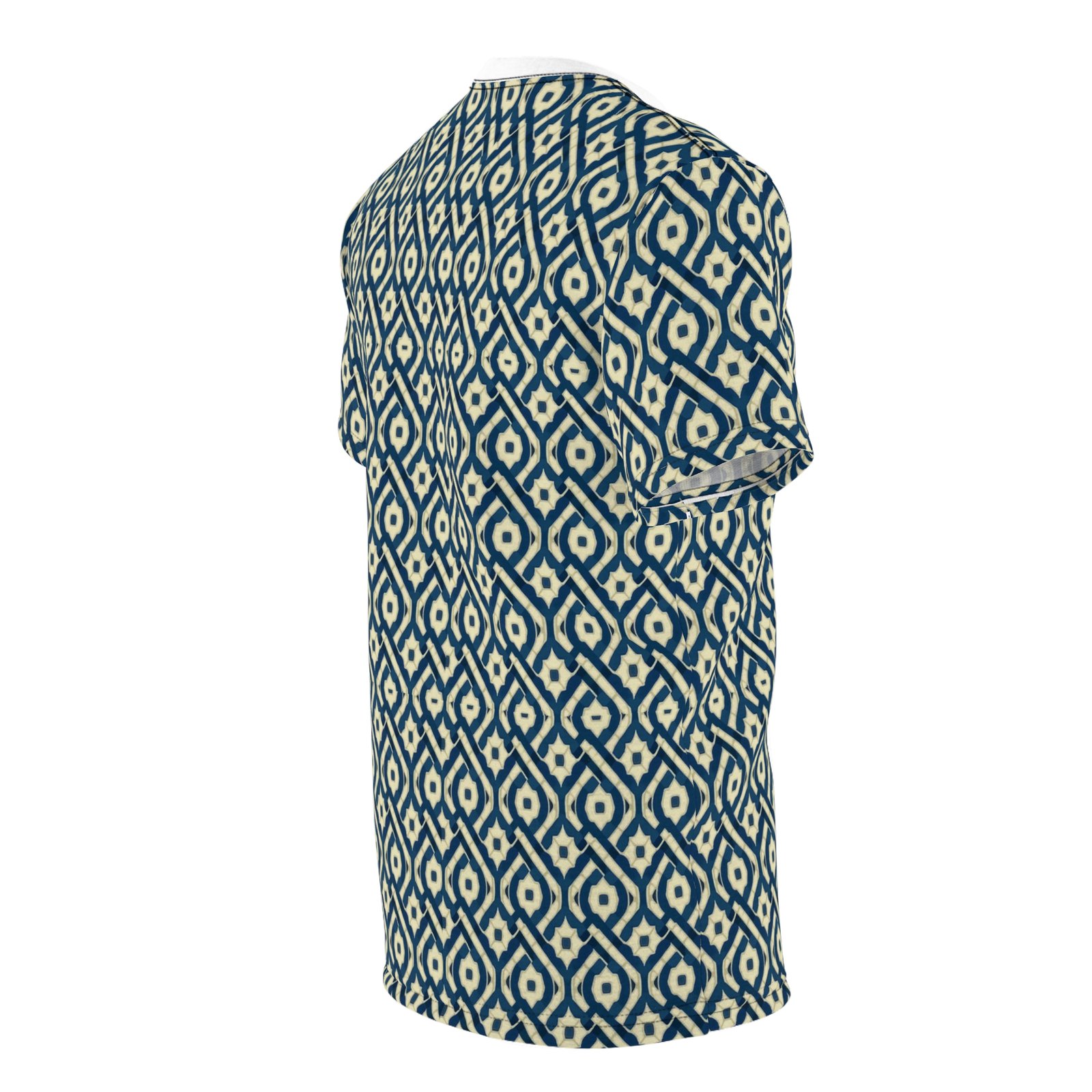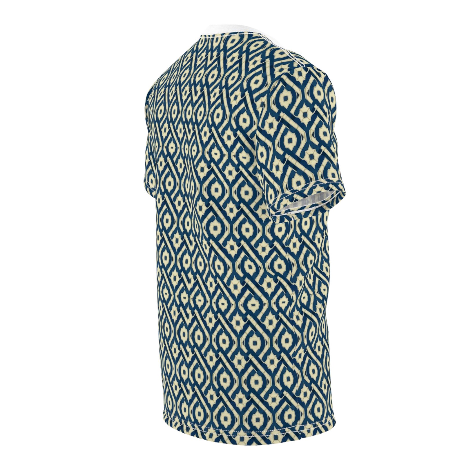 This all-over printed tee carries a handwoven-ikat vibe in deep indigo and warm cream, turning everyday wear into a textured, artisanal statement. Lightweight but durable polyester holds the intricate diamond pattern edge-to-edge, so the design flows across sleeves and body without breaks. The ribbed collar and shoulder tape keep the silhouette tidy after repeated wear, while the regular fit and tagless finish make it comfortable for long days—from gallery openings to weekend walks through the market. It feels like a well-traveled textile folded into a modern tee: familiar, textured, and quietly expressive.