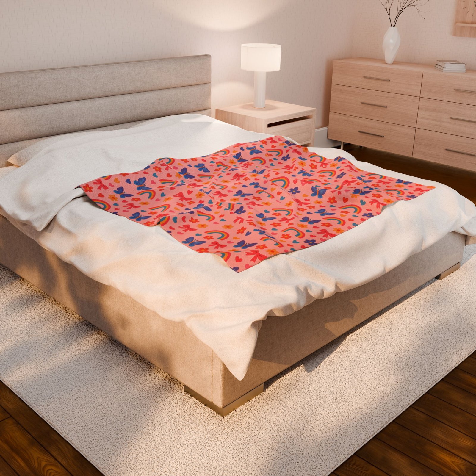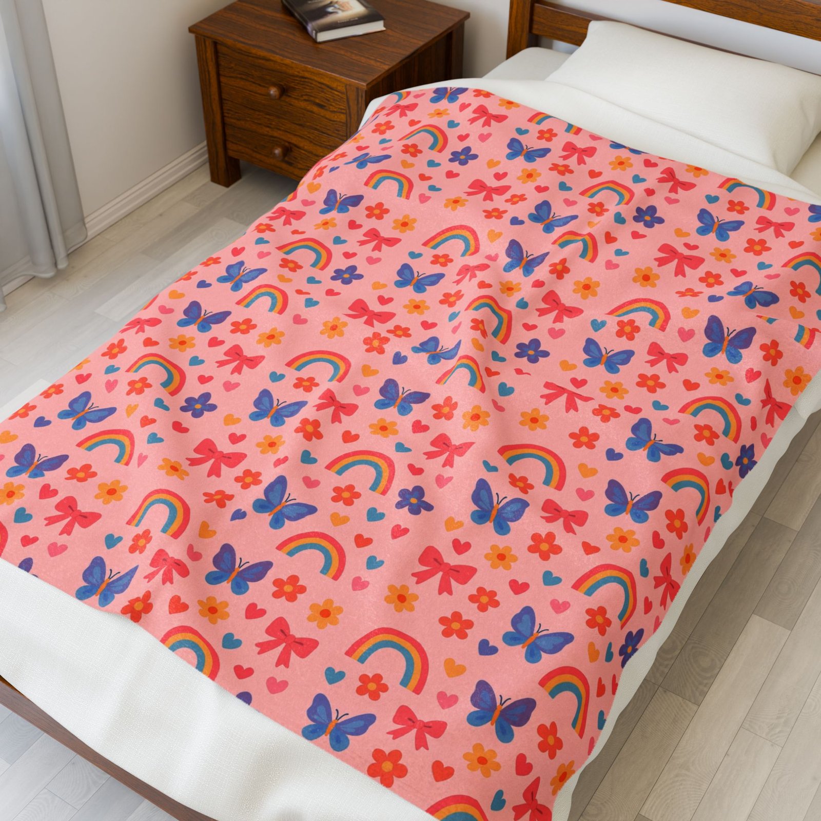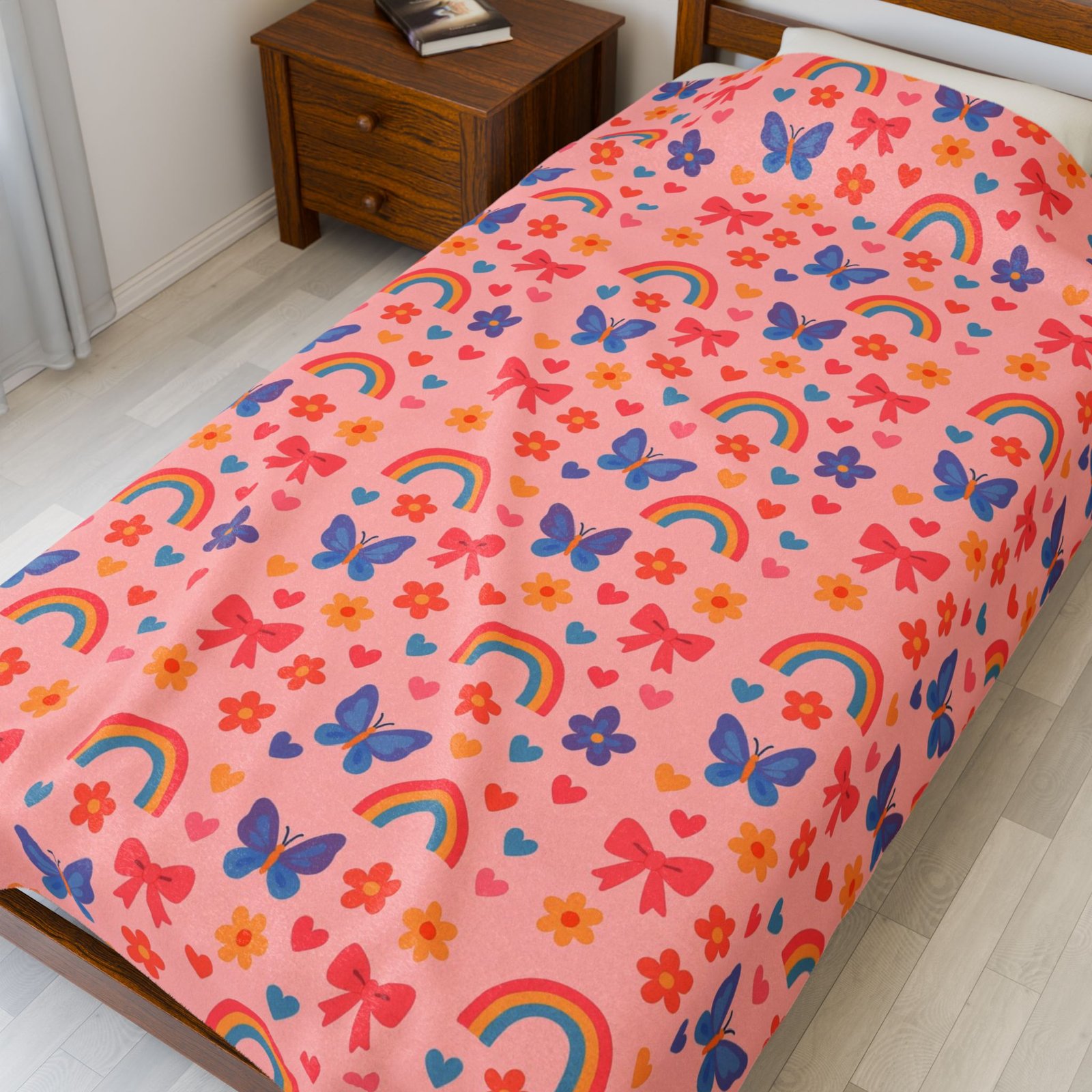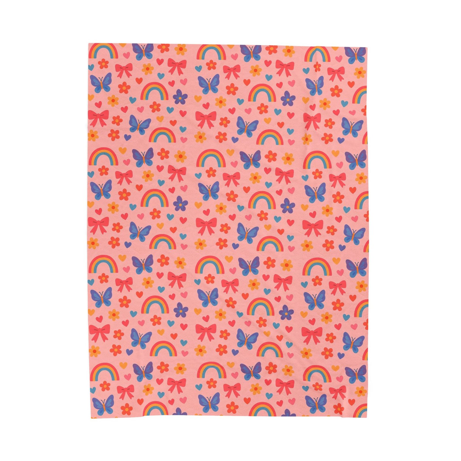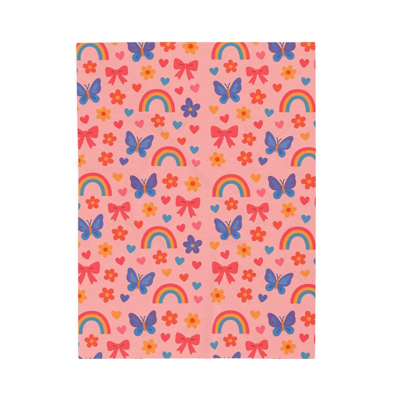 Wrap yourself in a soft, joyful hug. This plush blanket brings a whimsical pattern of rainbows, butterflies, and tiny flowers in warm, candy-like hues. It drapes easily over a couch or bed, brightening a reading nook or adding a playful layer at storytime. The medium-heavy fabric has a velvety hand that invites slow evenings, cozy movie nights, and quiet mornings with a mug and a good book. Lightweight enough to carry between rooms, yet substantial enough to feel comforting, it fits into homes that celebrate color, childhood wonder, and simple, tactile comforts.