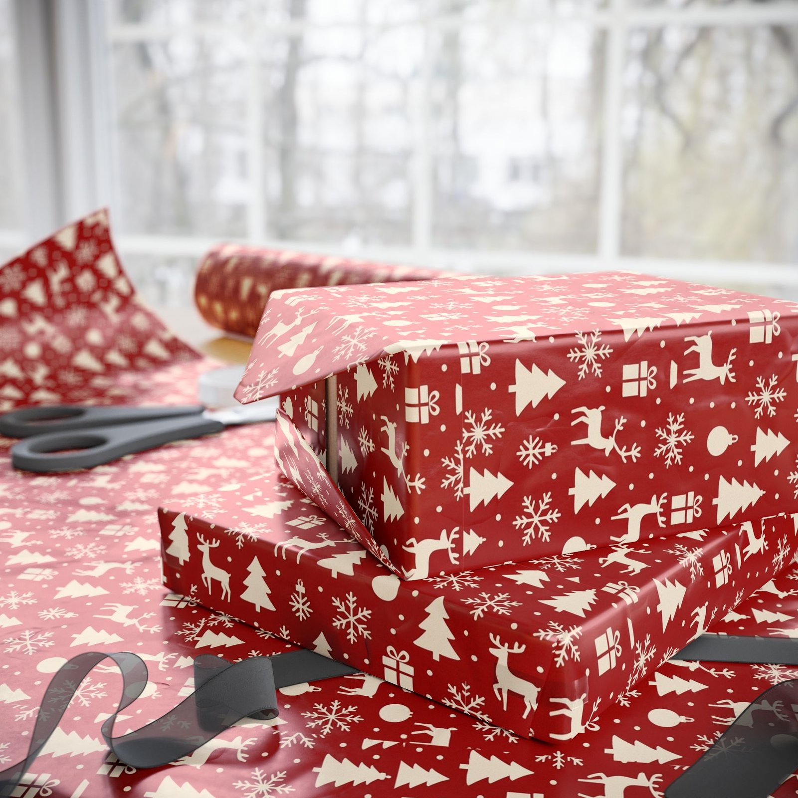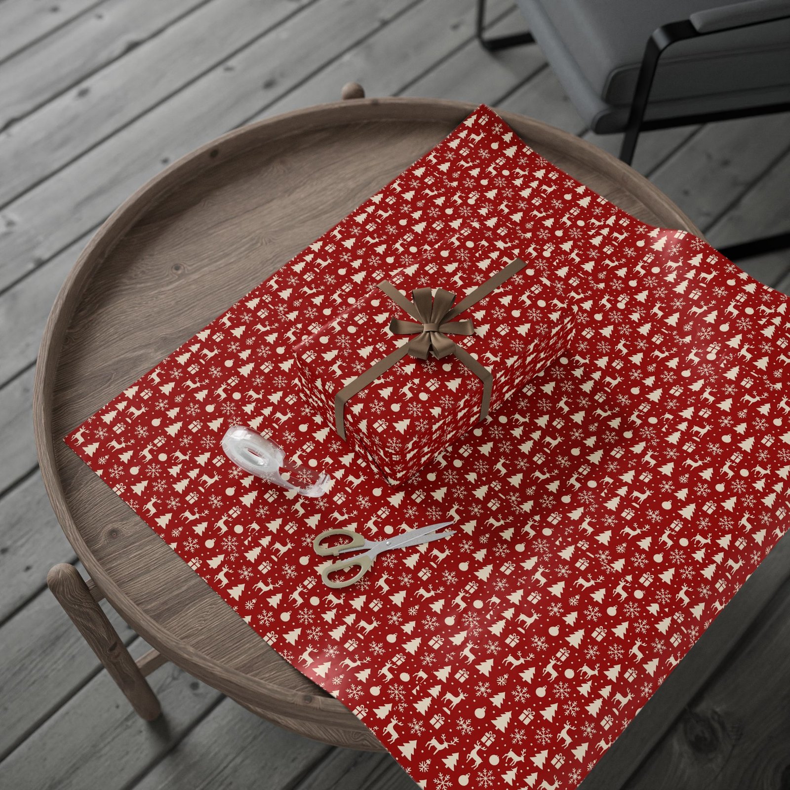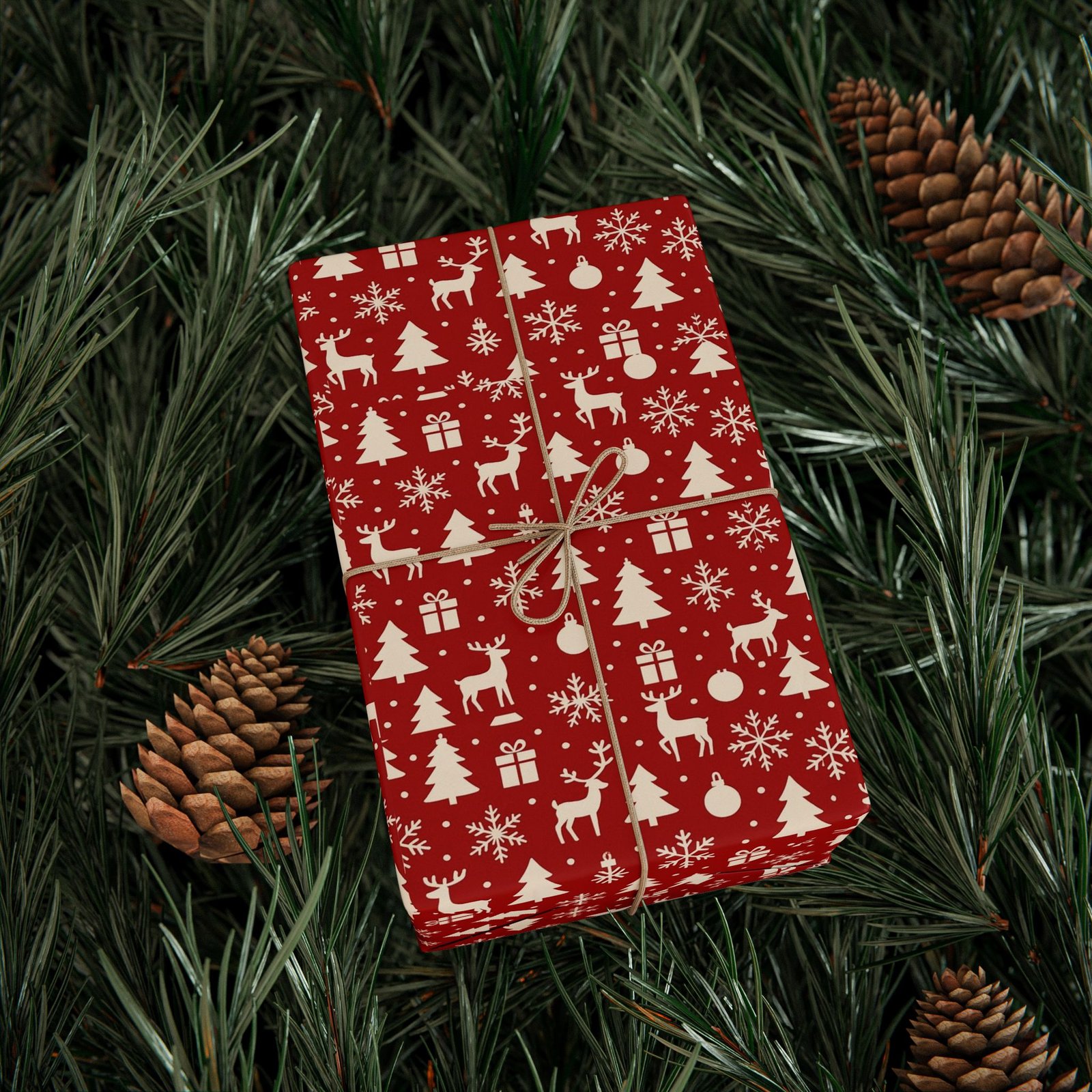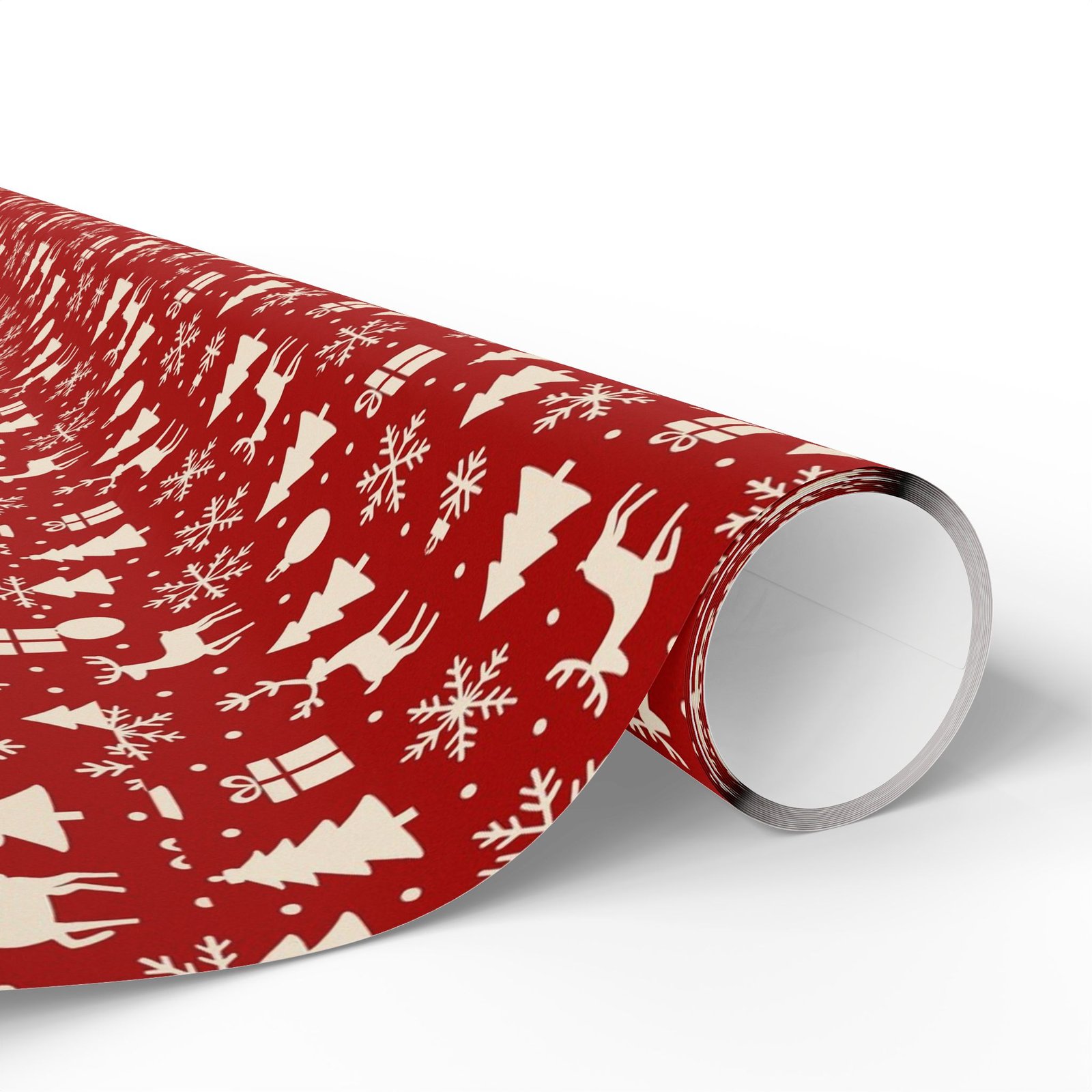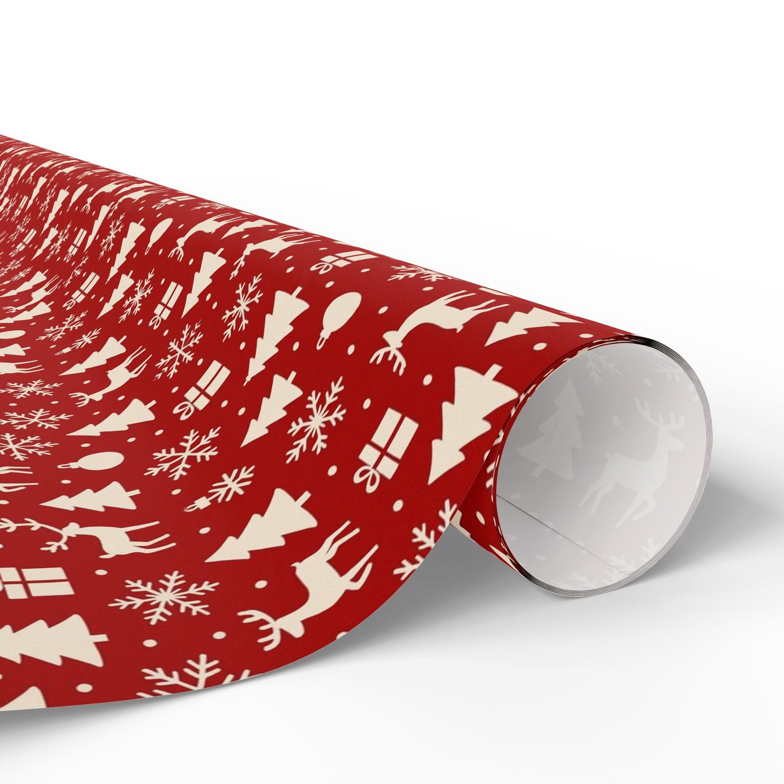 Crimson-red wrapping paper sprinkled with tiny cream holiday icons — trees, reindeer, snowflakes and gifts. The pattern reads as classic yet cozy, bringing a handmade feel to presents without fuss. Unfold it on a table, and the rich red with crisp cream motifs sets a warm, nostalgic mood: think quiet evenings trimming a tree, cookie crumbs on the counter, and the soft rustle of ribbon. Suited to people who enjoy traditional holiday palettes and thoughtful, low-key celebrations, this wrap adds an old-fashioned charm to birthdays, winter gatherings, and seasonal gift exchanges.