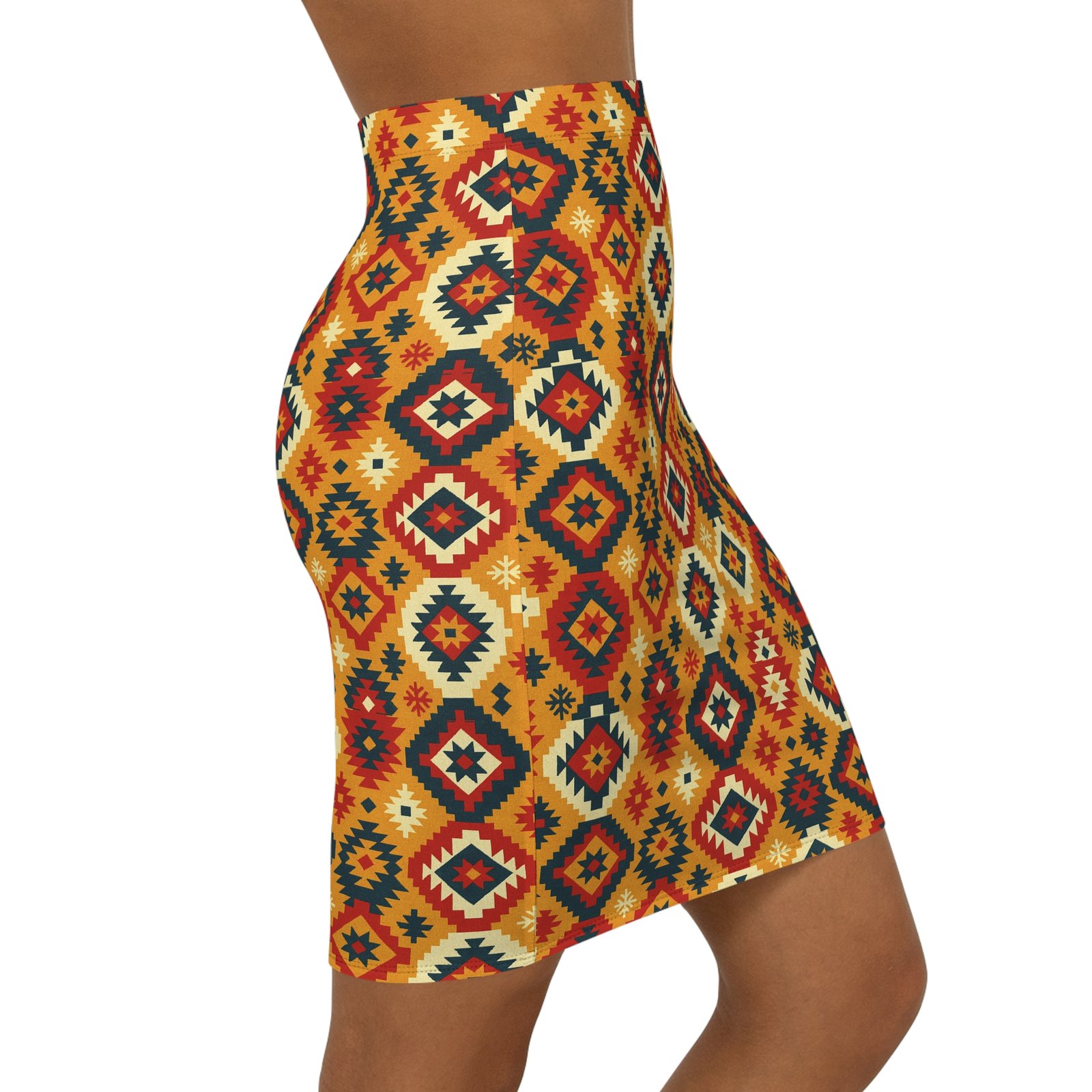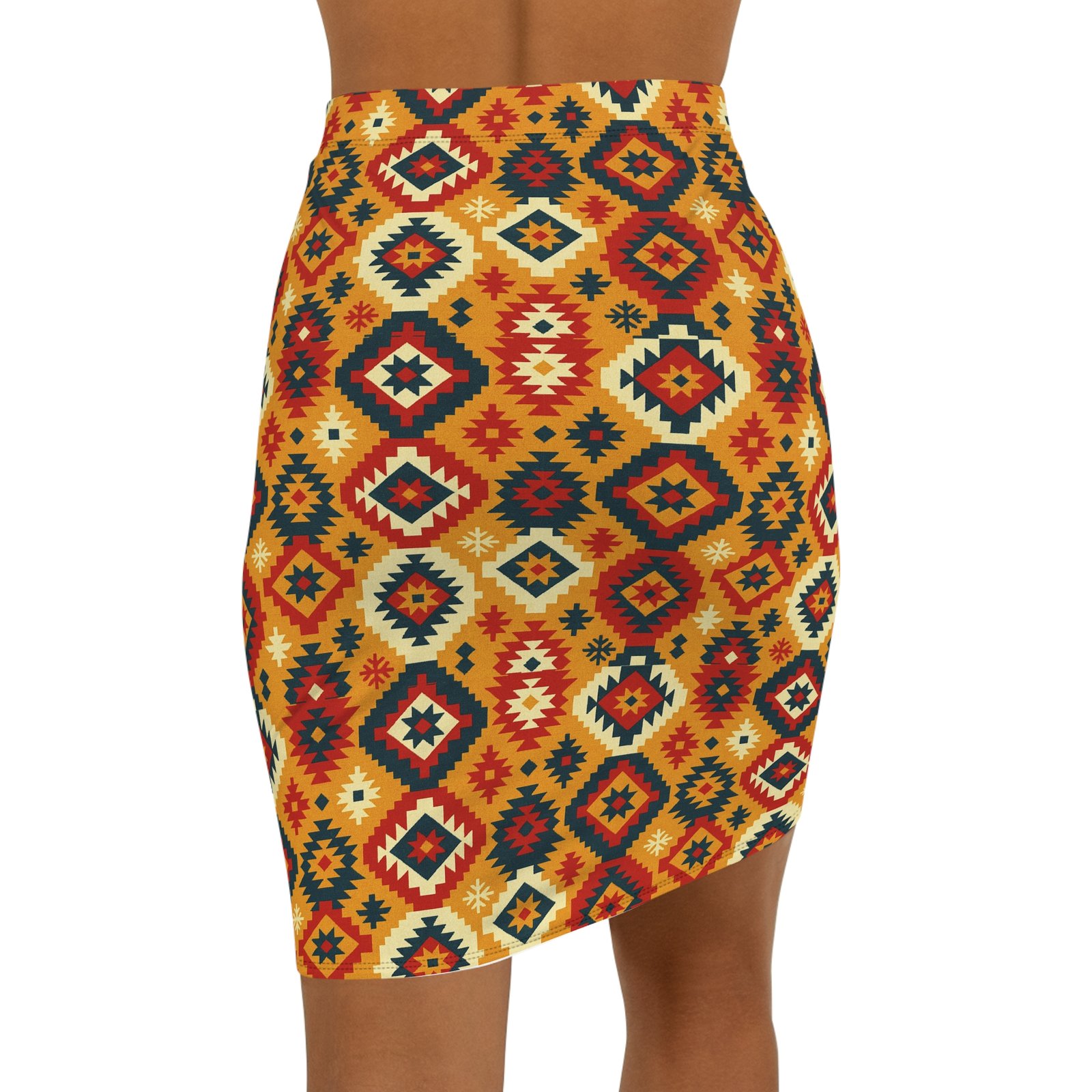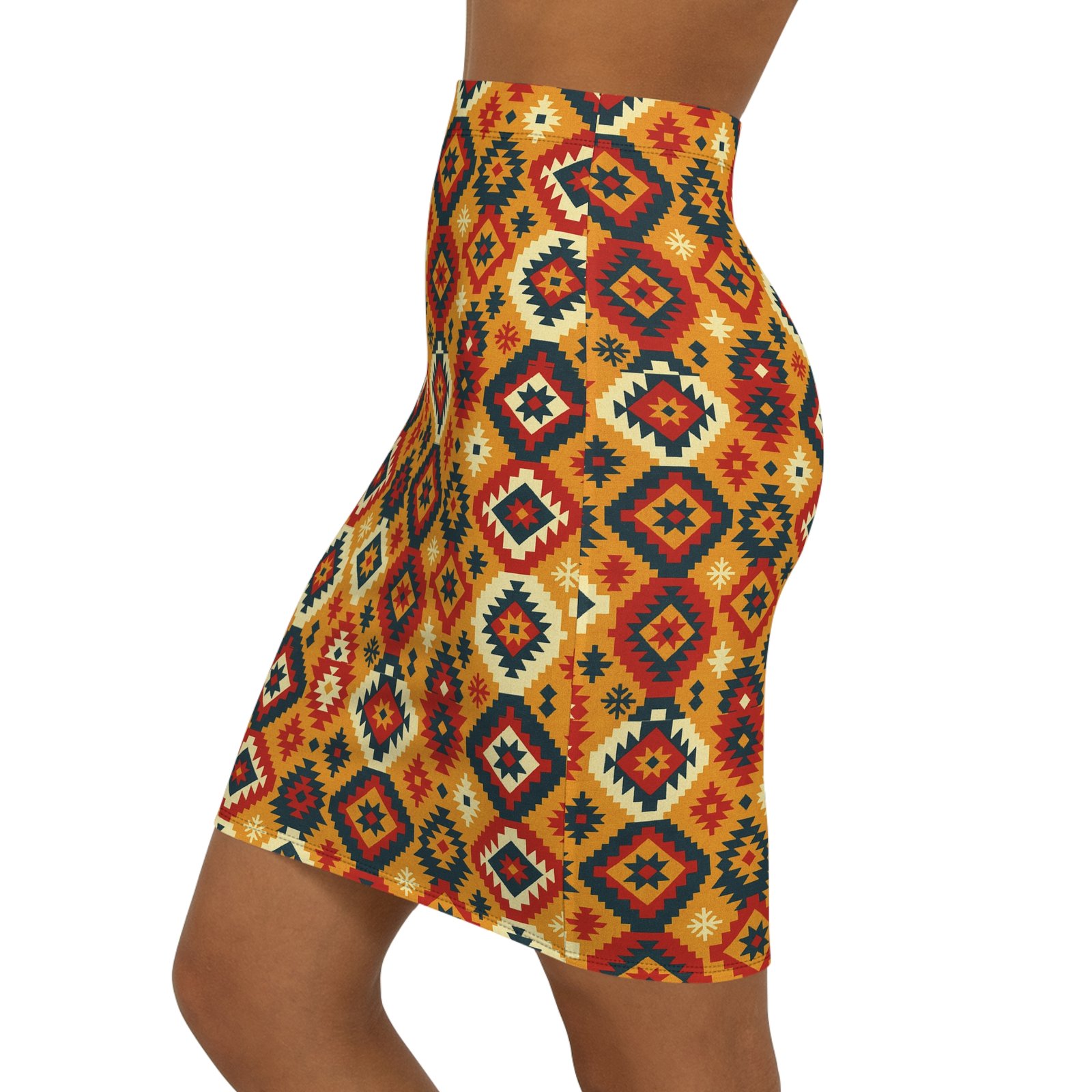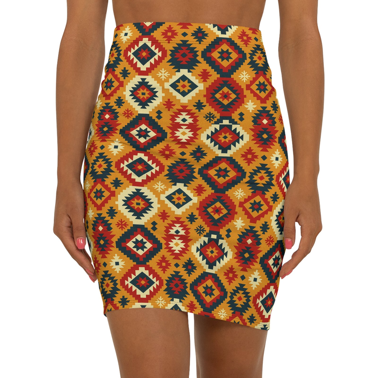 A slim mid-waist skirt that brings warm, tribal-inspired color into everyday wear. The close, pencil silhouette sits at the natural waist and follows the body with just enough stretch to move comfortably. Sunlit ochres, burnt sienna and deep teal form a repeating geometric pattern that reads like a modern take on woven textiles. Wear it with a tucked blouse and ankle boots for market days, or pair with a soft sweater for slow evenings around a neighborhood cafe. The elastic waistband and four-way stretch keep the shape flattering while letting you sit, walk, and dance without fuss. Lightweight and vivid, this skirt feels lived-in from the first wear and keeps its brightness through repeated use.