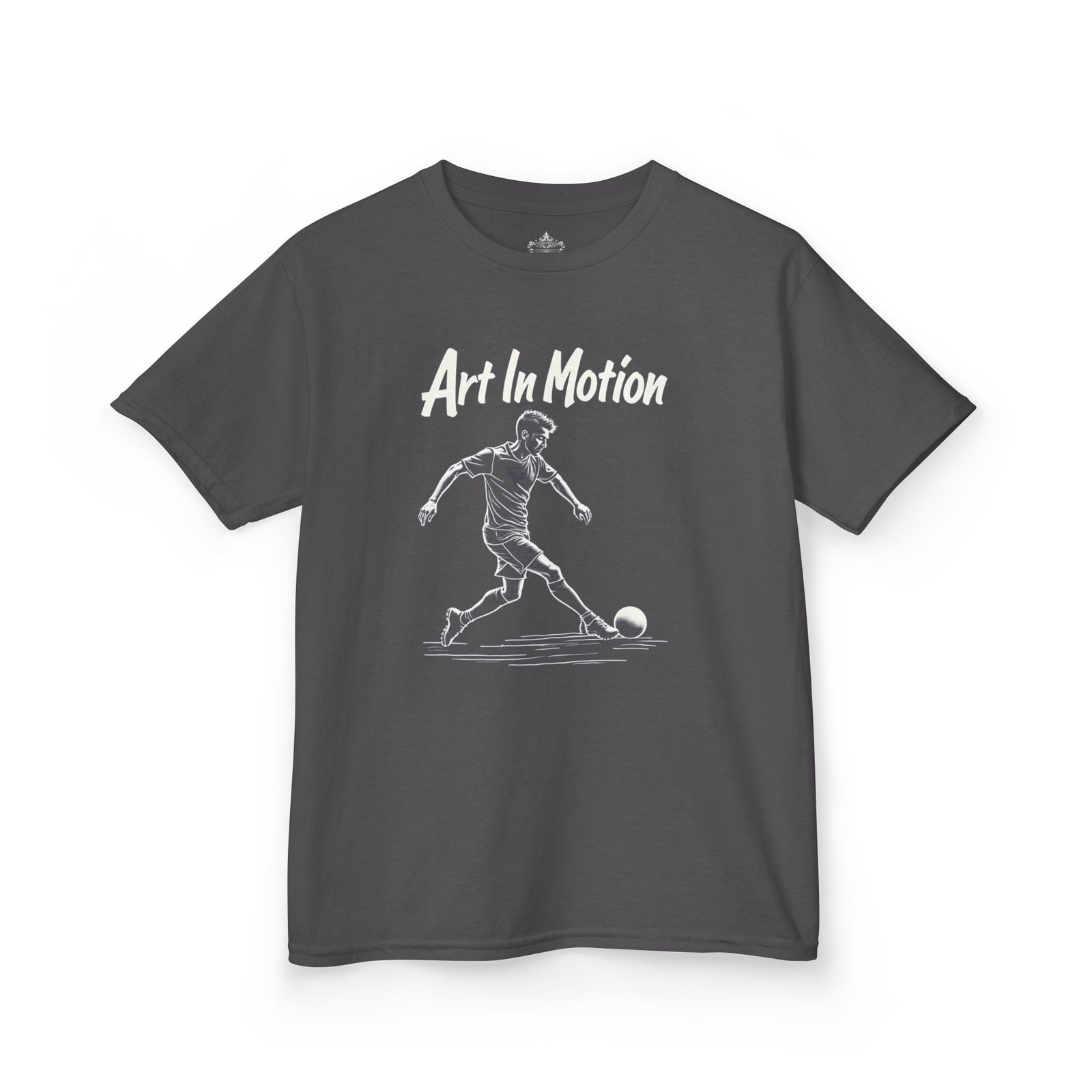 The Youth Soccer Tee in motion is perfect for active kids who love soccer. Made with 100% soft US cotton, this tee offers comfort and style for daily wear. It features a classic fit, ribbed knit collar, and tear-away labels for a scratch-free experience. Ideal for children who enjoy playing soccer or sports.